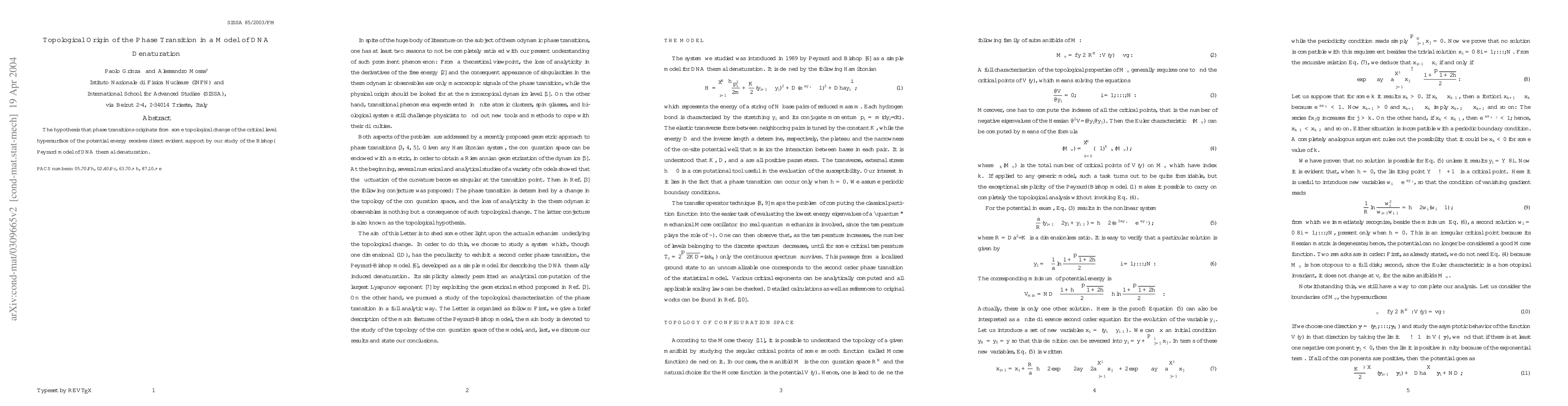The hypothesis that phase transitions originate from some topological change of the critical level hypersurface of the potential energy receives direct evident support by our study of the Bishop--Peyrard model of DNA thermal denaturation.