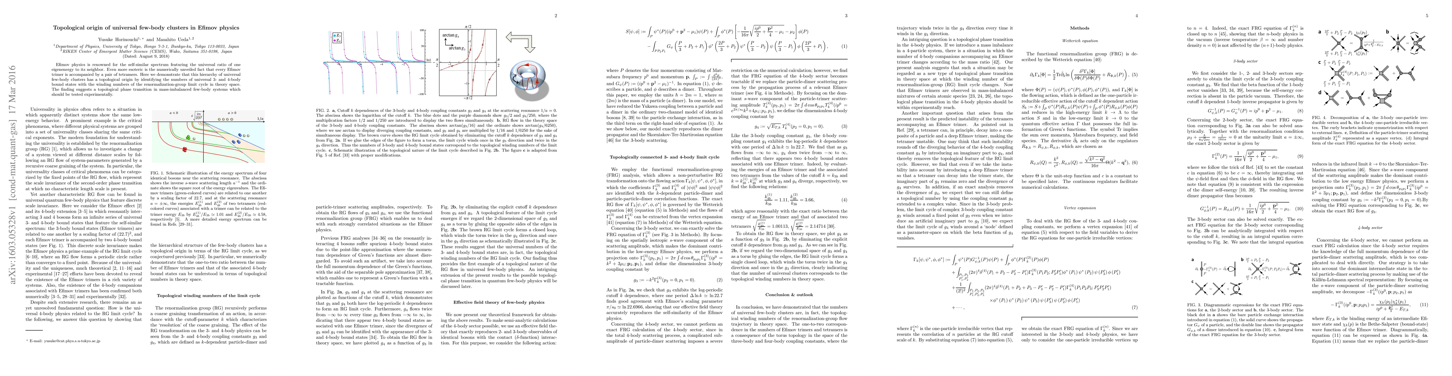 Efimov physics is renowned for the self-similar spectrum featuring the universal ratio of one eigenenergy to its neighbor. Even more esoteric is the numerically unveiled fact that every Efimov trimer is accompanied by a pair of tetramers. Here we demonstrate that this hierarchy of universal few-body clusters has a topological origin by identifying the numbers of universal 3- and 4-body bound states with the winding numbers of the renormalization-group limit cycle in theory space. The finding suggests a topological phase transition in mass-imbalanced few-body systems which should be tested experimentally.