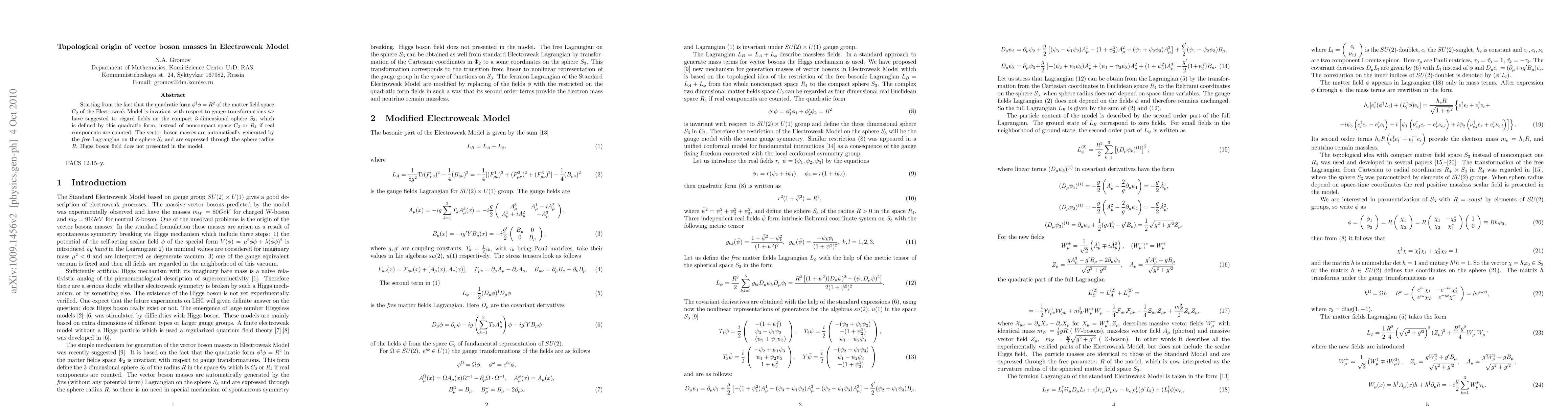 The topological mechanism for generation of vector boson masses in the Electroweak Model is discussed. Vector boson masses are automatically generated by transformation of the free Lagrangian from the noncompact $R_4$ matter fields space to the compact sphere $ S_3$. This model describes all experimentally observed fields and does not include the (up to now unobserved) scalar Higgs field. $W$- and $Z$-boson masses are expressed through the parameter $R$ by the same formulas as in the standard case. The free parameter $R$ of the model is now interpreted as the curvature radius of the spherical matter fields space. The development of this topological idea in different aspects, such as transformation to radial coordinates or nonlinearly realized gauge group or nonlinear partial-trace sigma-model, is briefly reviewed.