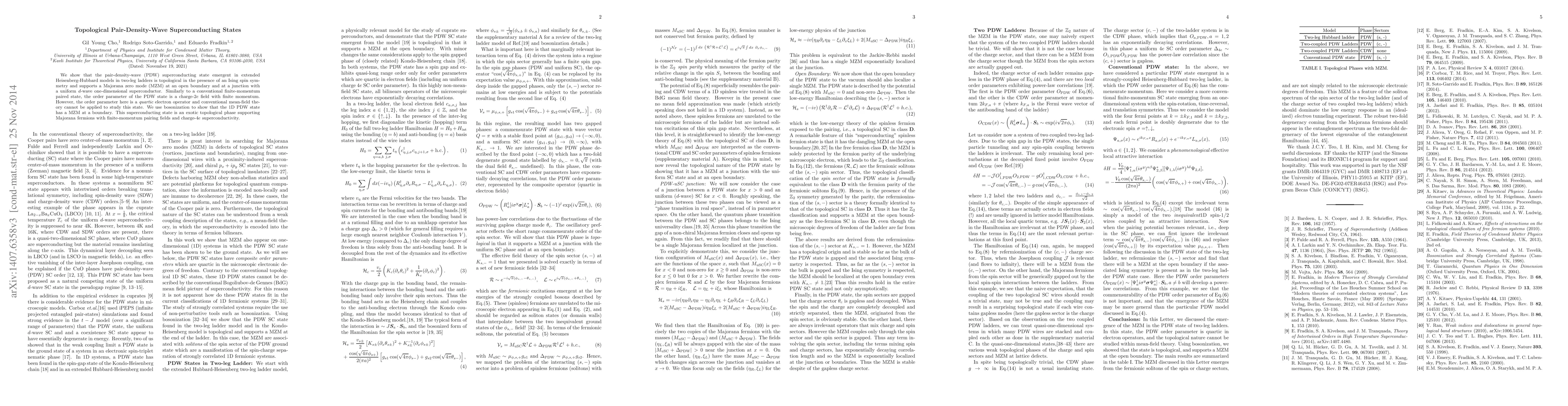 This paper demonstrates that a pair-density-wave (PDW) superconducting state in two-leg ladders is topological, supporting Majorana zero modes at open boundaries and junctions with $d$-wave superconductors. Unlike conventional states, the PDW order parameter is a quartic electron operator, necessitating bosonization for analysis.
