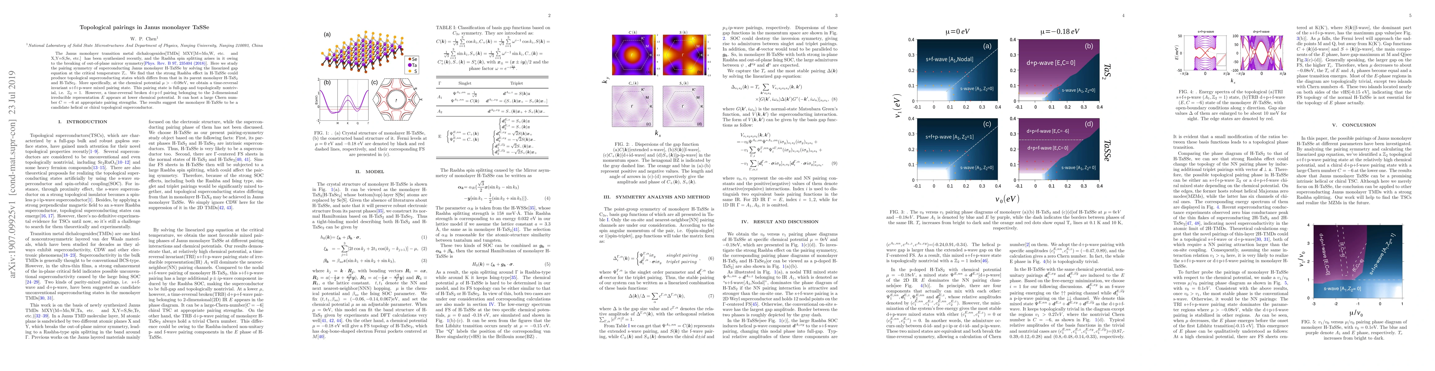 This paper investigates the superconducting pairing symmetry in the topological Janus monolayer H-TaSSe, revealing a time-reversal invariant s+f+p-wave mixed pairing state that is full-gap and topologically nontrivial. At lower chemical potentials, a time-reversal broken d+p+f pairing emerges, capable of hosting a large Chern number, indicating H-TaSSe's potential as a helical or chiral topological superconductor.