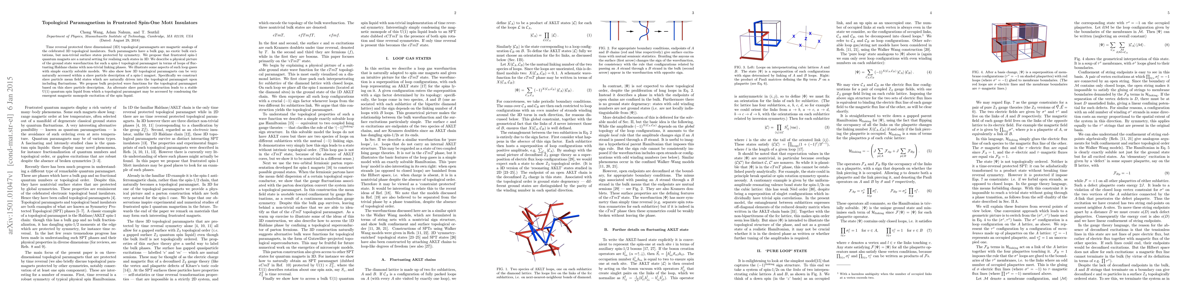 Time reversal protected three dimensional (3D) topological paramagnets are magnetic analogs of the celebrated 3D topological insulators. Such paramagnets have a bulk gap, no exotic bulk excitations, but non-trivial surface states protected by symmetry. We propose that frustrated spin-1 quantum magnets are a natural setting for realising such states in 3D. We describe a physical picture of the ground state wavefunction for such a spin-1 topological paramagnet in terms of loops of fluctuating Haldane chains with non-trivial linking phases. We illustrate some aspects of such loop gases with simple exactly solvable models. We also show how 3D topological paramagnets can be very naturally accessed within a slave particle description of a spin-1 magnet. Specifically we construct slave particle mean field states which are naturally driven into the topological paramagnet upon including fluctuations. We propose bulk projected wave functions for the topological paramagnet based on this slave particle description. An alternate slave particle construction leads to a stable U(1) quantum spin liquid from which a topological paramagnet may be accessed by condensing the emergent magnetic monopole excitation of the spin liquid.