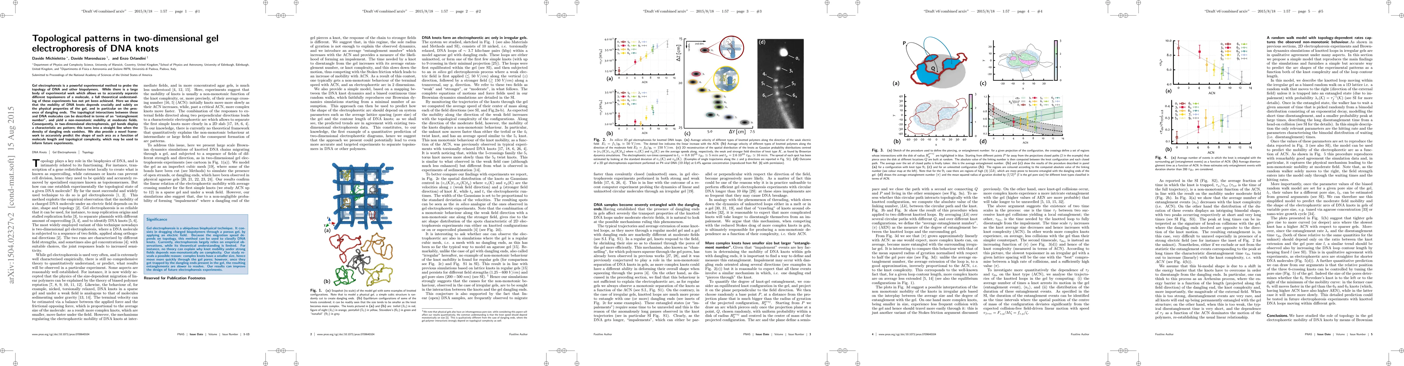 This paper investigates the topological patterns in gel electrophoresis of DNA knots, revealing that DNA knot mobility is influenced by gel properties and dangling ends. It introduces an "entanglement number" to describe topological interactions, leading to non-monotonic mobility and characteristic arc patterns in two-dimensional electrophoresis.