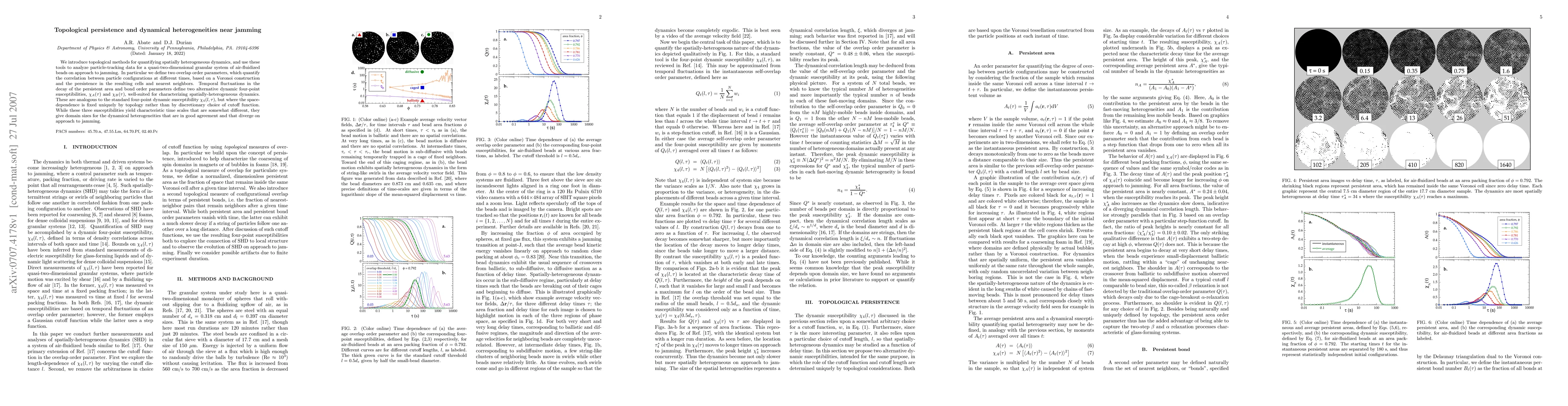 We introduce topological methods for quantifying spatially heterogeneous dynamics, and use these tools to analyze particle-tracking data for a quasi-two-dimensional granular system of air-fluidized beads on approach to jamming. In particular we define two overlap order parameters, which quantify the correlation between particle configurations at different times, based on a Voronoi construction and the persistence in the resulting cells and nearest neighbors. Temporal fluctuations in the decay of the persistent area and bond order parameters define two alternative dynamic four-point susceptibilities, XA(t) and XB(t), well-suited for characterizing spatially-heterogeneous dynamics. These are analogous to the standard four-point dynamic susceptibility X4(l,t), but where the space-dependence is fixed uniquely by topology rather than by discretionary choice of cutoff function. While these three susceptibilities yield characteristic time scales that are somewhat different, they give domain sizes for the dynamical heterogeneities that are in good agreement and that diverge on approach to jamming.