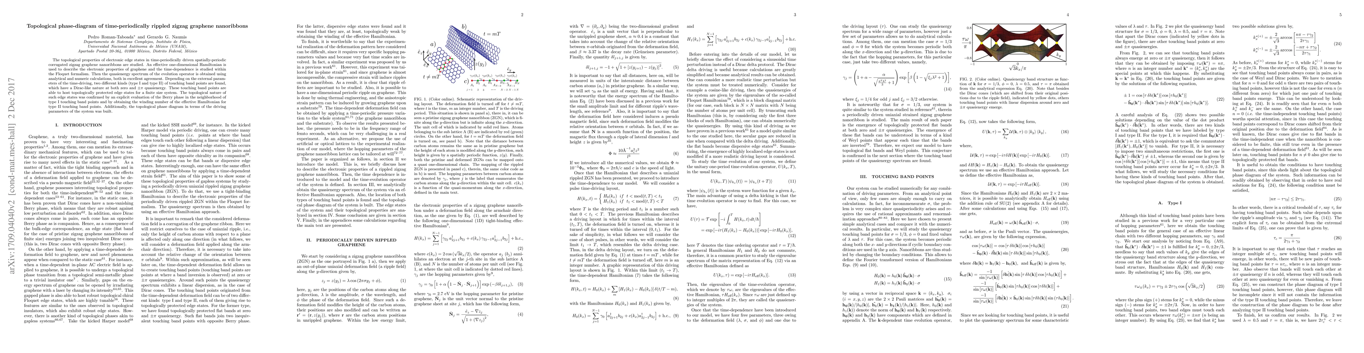 This paper investigates the topological properties of zigzag graphene nanoribbons periodically rippled in time, revealing two types of touching band points (type I and type II) that host topologically protected edge states. The study employs an effective one-dimensional Hamiltonian and the Floquet formalism to analyze the quasienergy spectrum, confirming the topological nature through Berry phase and winding number evaluations.