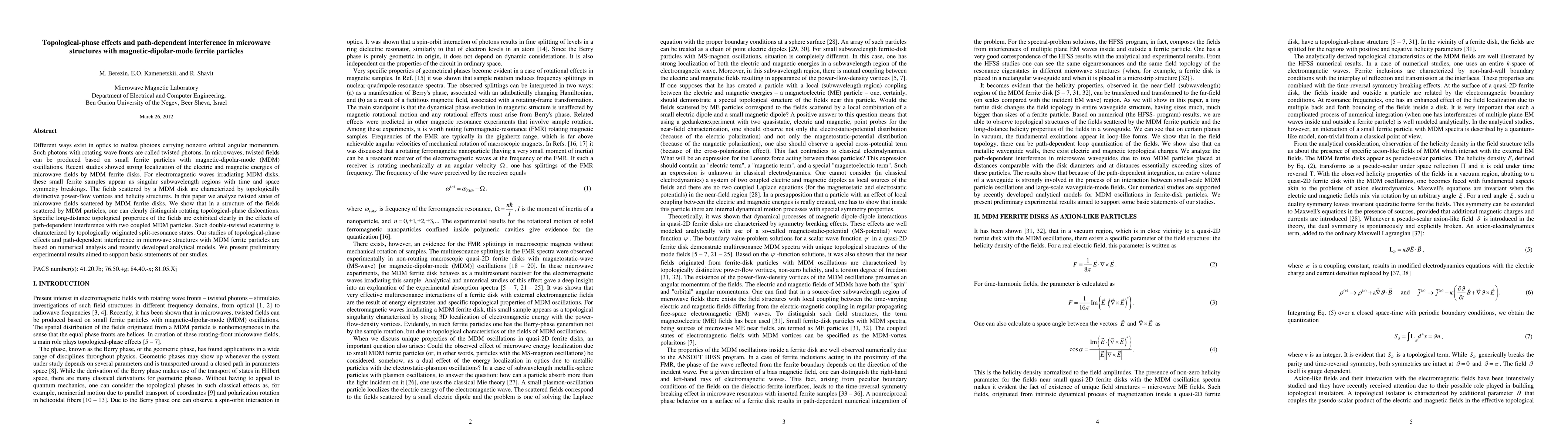 Different ways exist in optics to realize photons carrying nonzero orbital angular momentum. Such photons with rotating wave fronts are called twisted photons. In microwaves, twisted fields can be produced based on small ferrite particles with magnetic-dipolar-mode (MDM) oscillations. Recent studies showed strong localization of the electric and magnetic energies of microwave fields by MDM ferrite disks. For electromagnetic waves irradiating MDM disks, these small ferrite samples appear as singular subwavelength regions with time and space symmetry breakings. The fields scattered by a MDM disk are characterized by topologically distinctive power-flow vortices and helicity structures. In this paper we analyze twisted states of microwave fields scattered by MDM ferrite disks. We show that in a structure of the fields scattered by MDM particles, one can clearly distinguish rotating topological-phase dislocations. Specific long-distance topological properties of the fields are exhibited clearly in the effects of path-dependent interference with two coupled MDM particles. Such double-twisted scattering is characterized by topologically originated split-resonance states. Our studies of topological-phase effects and path-dependent interference in microwave structures with MDM ferrite particles are based on numerical analysis and recently developed analytical models. We present preliminary experimental results aimed to support basic statements of our studies.