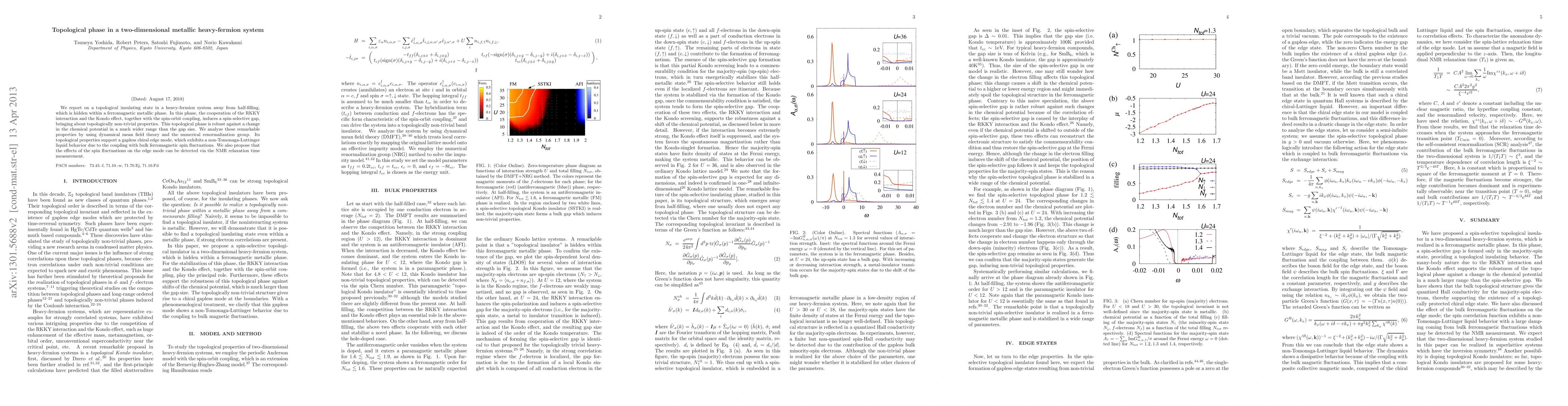 This paper reports on a topological insulating state in a metallic heavy-fermion system, hidden within a ferromagnetic metallic phase, characterized by a spin-selective gap induced by RKKY interaction, Kondo effect, and spin-orbit coupling. The topological phase is robust and supports a gapless chiral edge mode with unique non-Tomonaga-Luttinger liquid behavior, detectable via NMR relaxation time measurements.