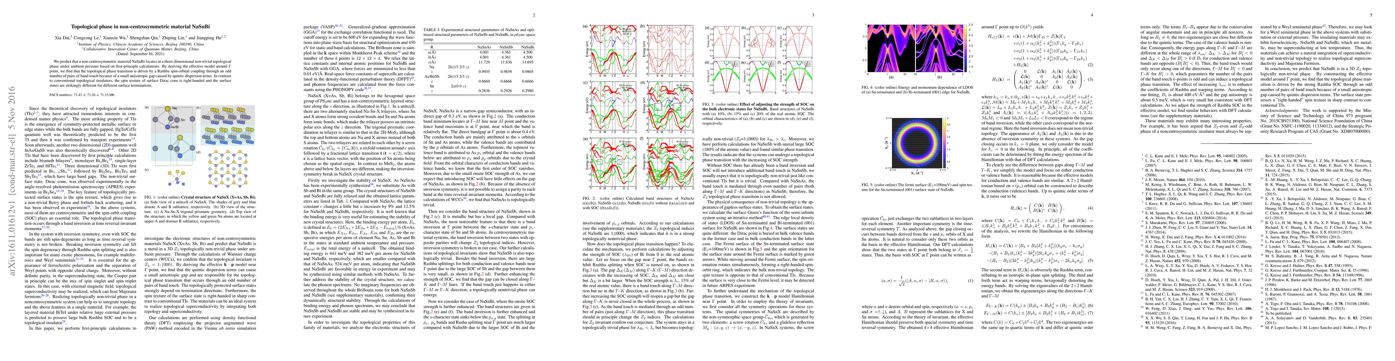 This research predicts that NaSnBi, a non-centrosymmetric material, exhibits a three-dimensional topological phase driven by Rashba spin-orbital coupling, characterized by an odd number of band touch pairs. Unlike conventional topological insulators, its surface states display right-handed spin texture and vary with surface terminations.