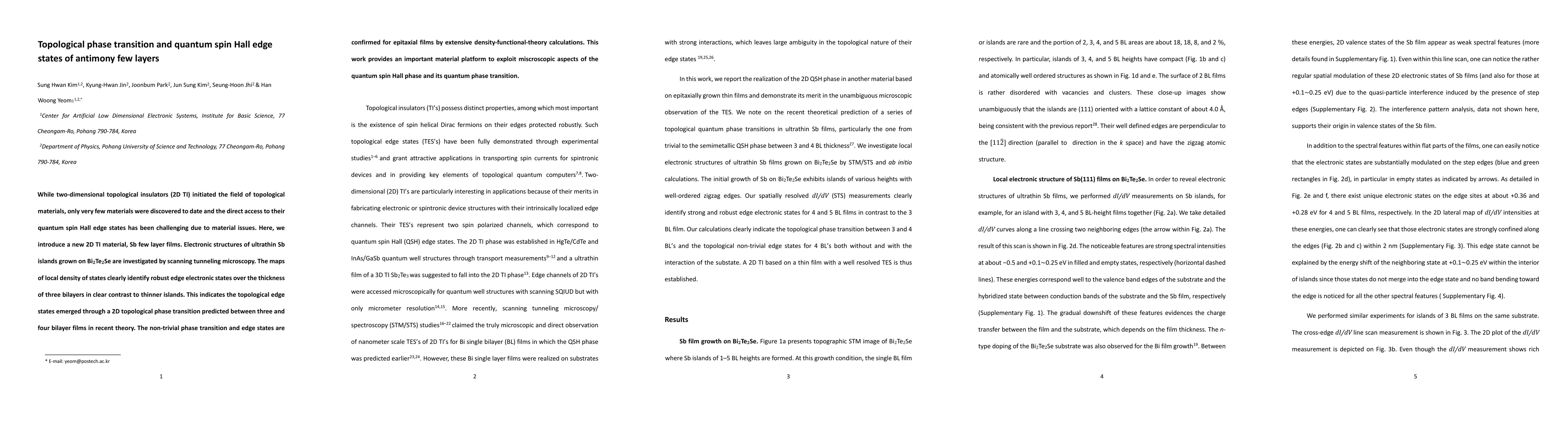 While two-dimensional topological insulators (2D TI) initiated the field of topological materials, only very few materials were discovered to date and the direct access to their quantum spin Hall edge states has been challenging due to material issues. Here, we introduce a new 2D TI material, Sb few layer films. Electronic structures of ultrathin Sb islands grown on Bi2Te2Se are investigated by scanning tunneling microscopy. The maps of local density of states clearly identify robust edge electronic states over the thickness of three bilayers in clear contrast to thinner islands. This indicates the topological edge states emerged through a 2D topological phase transition predicted between three and four bilayer films in recent theory. The non-trivial phase transition and edge states are confirmed for epitaxial films by extensive density-functional-theory calculations. This work provides an important material platform to exploit miscroscopic aspects of the quantum spin Hall phase and its quantum phase transition.