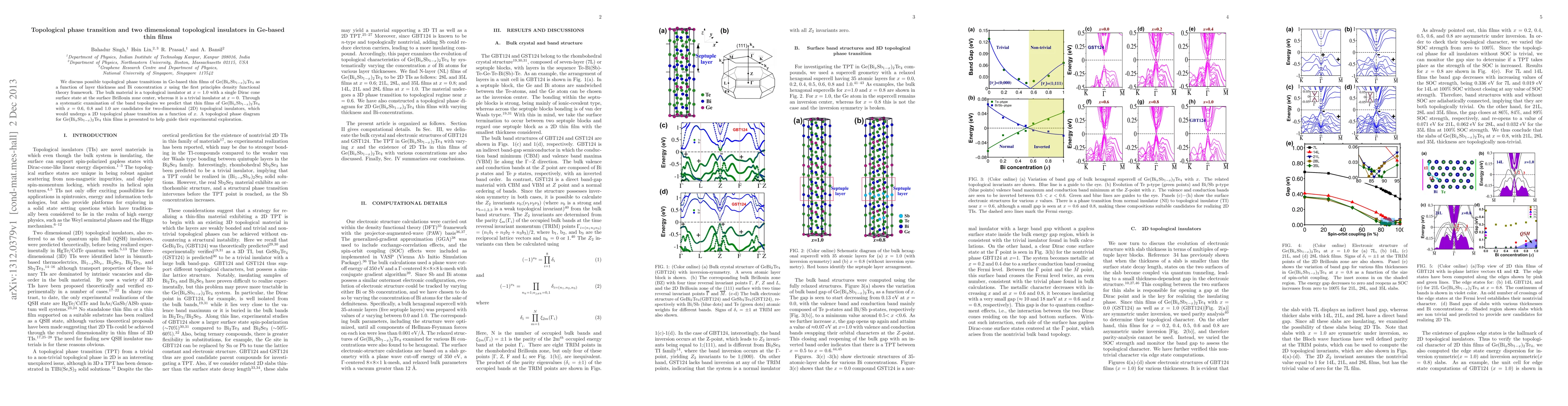 This paper investigates topological phase transitions in Ge-based thin films of Ge(Bi$_x$Sb$_{1-x}$)$_2$Te$_4$ using density functional theory, predicting that films with Bi concentrations $x$ = 0.6, 0.8, and 1.0 exhibit 2D topological insulating behavior, transitioning as a function of $x$.
