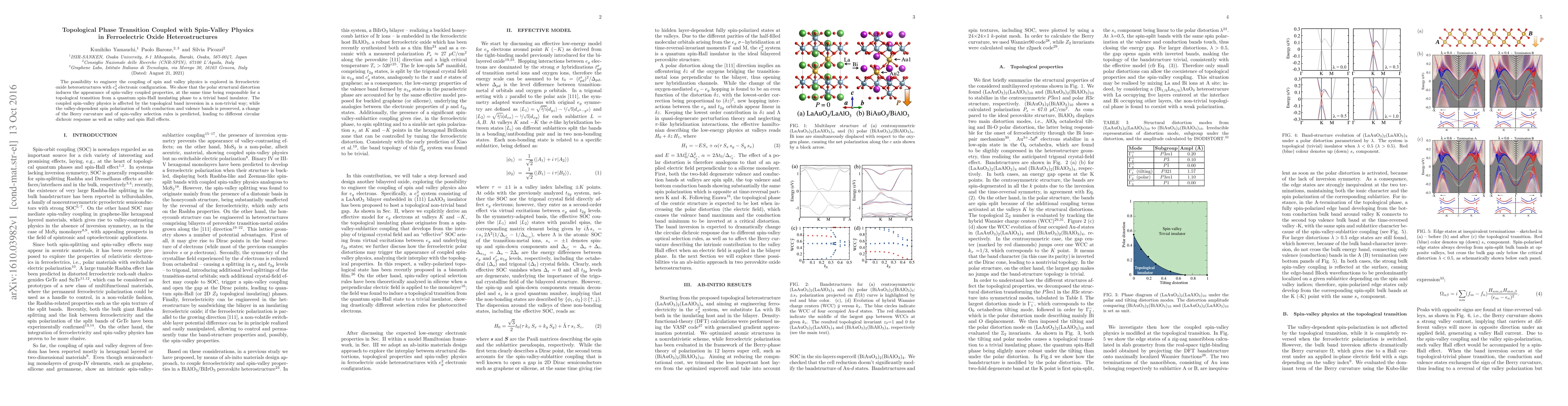 This paper investigates ferroelectric oxide heterostructures, revealing that structural distortions induce spin-valley coupled properties and a topological phase transition from a quantum spin-Hall insulator to a trivial band insulator, affecting the valley-dependent spin polarization while altering the Berry curvature and spin-valley selection rules.