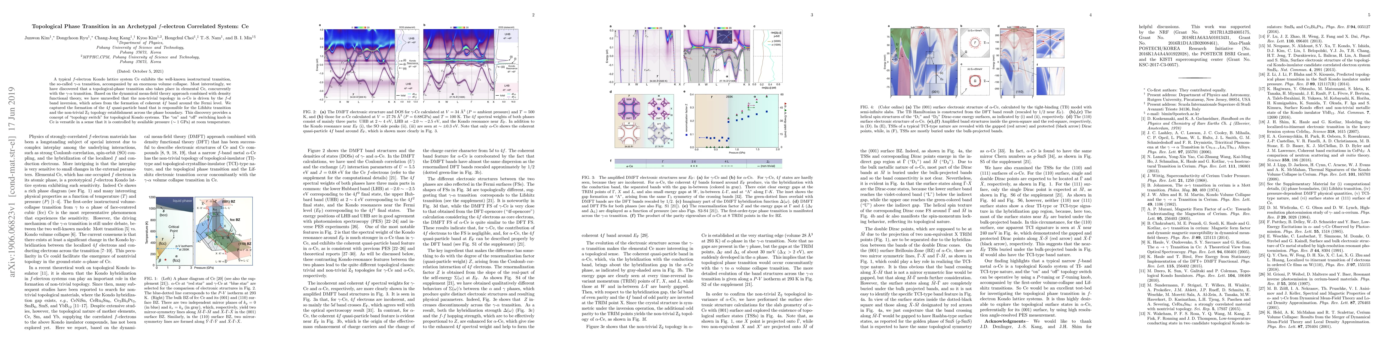 A typical f-electron Kondo lattice system Ce exhibits the well-known isostructural transition, the so-called gamma-alpha transition, accompanied by an enormous volume collapse. Most interestingly, we have discovered that a topological-phase transition also takes place in elemental Ce, concurrently with the gamma-alpha transition. Based on the dynamical mean-field theory approach combined with density functional theory, we have unravelled that the non-trivial topology in alpha-Ce is driven by the f-d band inversion, which arises from the formation of coherent 4f band around the Fermi level. We captured the formation of the 4f quasi-particle band that is responsible for the Lifshitz transition and the non-trivial Z2 topology establishment across the phase boundary. This discovery provides a concept of 'topology switch' for topological Kondo systems. The 'on' and 'off' switching knob in Ce is versatile in a sense that it is controlled by available pressure (around 1 GPa) at room temperature.