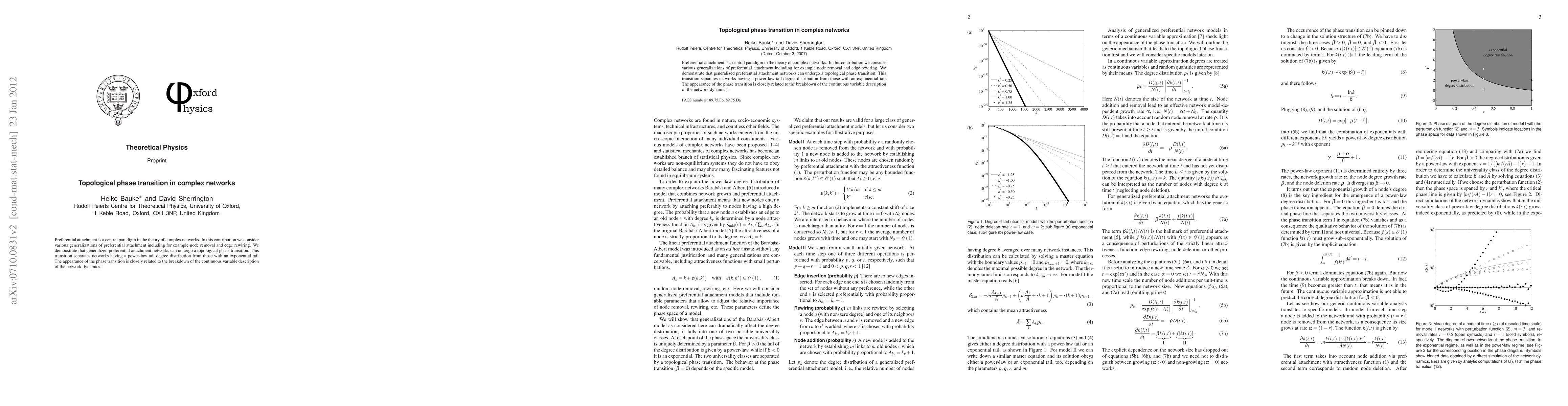 This paper explores generalized preferential attachment mechanisms in complex networks, showing that these can lead to a topological phase transition distinguishing networks with power-law versus exponential degree distributions, linked to the failure of continuous variable network dynamics.