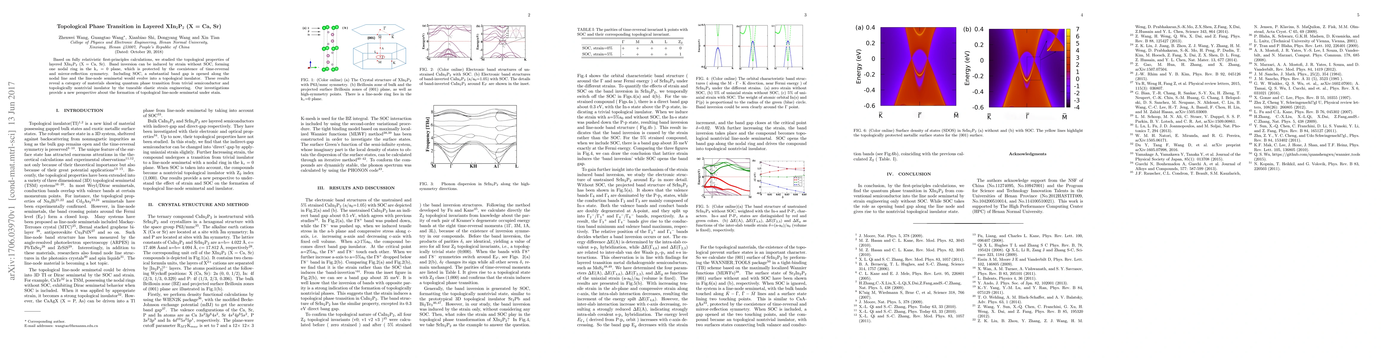 Based on fully relativistic first-principles calculations, we studied the topological properties of layered XIn$_2$P$_2$ (X = Ca, Sr). Band inversion can be induced by strain without SOC, forming one nodal ring in the k$_z$ = 0 plane, which is protected by the coexistence of time-reversal and mirror-reflection symmetry. Including SOC, a substantial band gap is opened along the nodal line and the line-node semimetal would evolve into a topological insulator. These results reveal a category of materials showing quantum phase transition from trivial semiconductor and topologically nontrivial insulator by the tuneable elastic strain engineering. Our investigations provide a new perspective about the formation of topological line-node semimetal under stain.