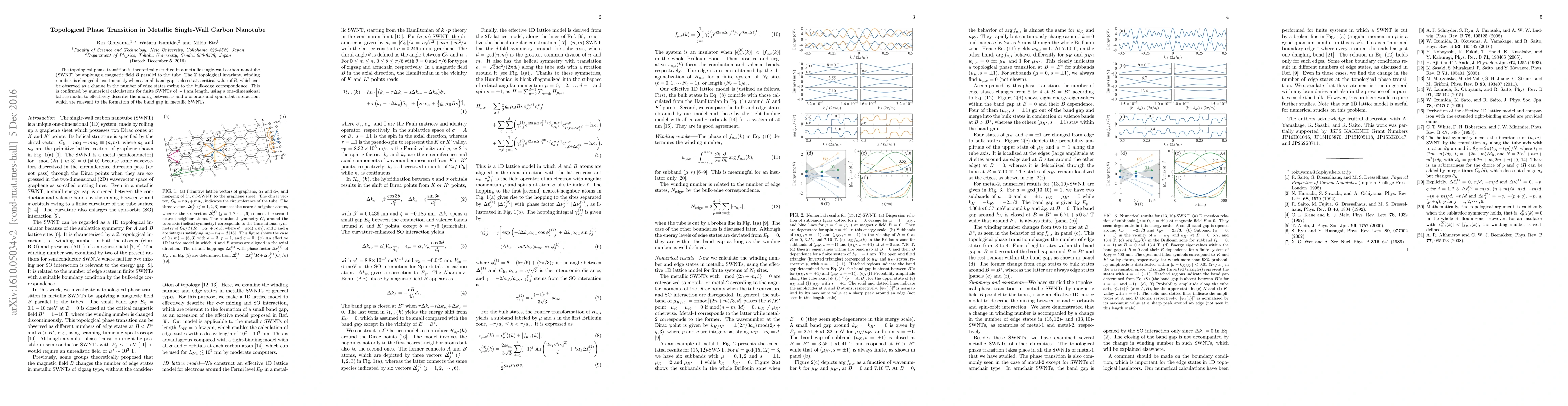 Researchers studied topological phase transitions in metallic single-wall carbon nanotubes under a magnetic field, finding that a small band gap closes at a critical value of B, changing the number of edge states. The study used numerical calculations to confirm these findings using a one-dimensional lattice model.