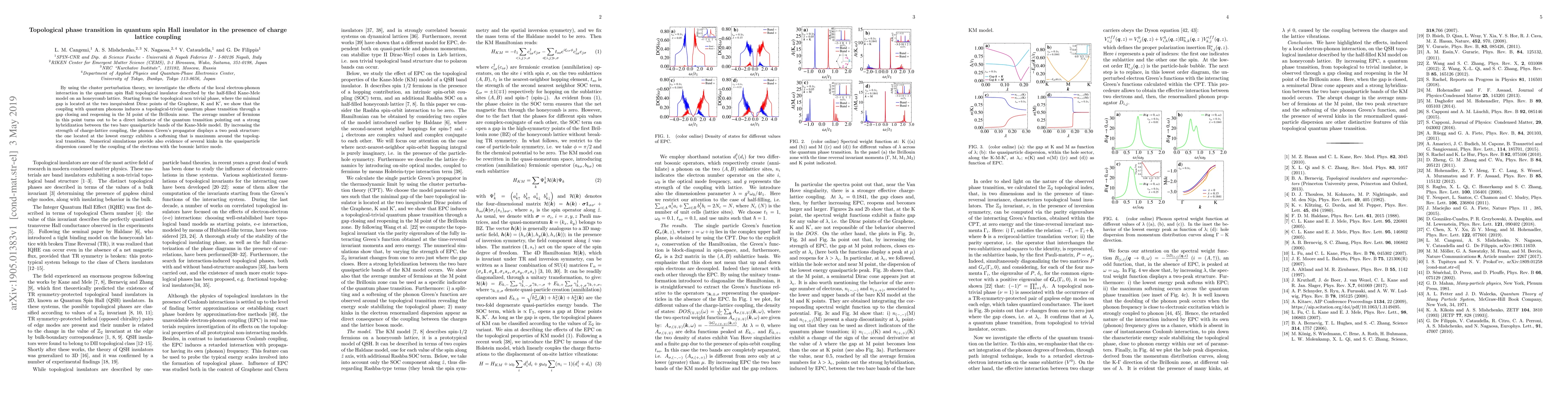 By using the cluster perturbation theory, we investigate the effects of the local electron-phonon interaction in the quantum spin Hall topological insulator described by the half-filled Kane-Mele model on an honeycomb lattice. Starting from the topological non trivial phase, where the minimal gap is located at the two inequivalent Dirac points of the Graphene, $\text{K}$ and $\text{K}'$, we show that the coupling with quantum phonons induces a topological-trivial quantum phase transition through a gap closing and reopening in the $\text{M}$ point of the Brillouin zone. The average number of fermions in this point turns out to be a direct indicator of the quantum transition pointing out a strong hybridization between the two bare quasiparticle bands of the Kane-Mele model. By increasing the strength of charge-lattice coupling, the phonon Green's propagator displays a two peak structure: the one located at the lowest energy exhibits a softening that is maximum around the topological transition. Numerical simulations provide also evidence of several kinks in the quasiparticle dispersion caused by the coupling of the electrons with the bosonic lattice mode.