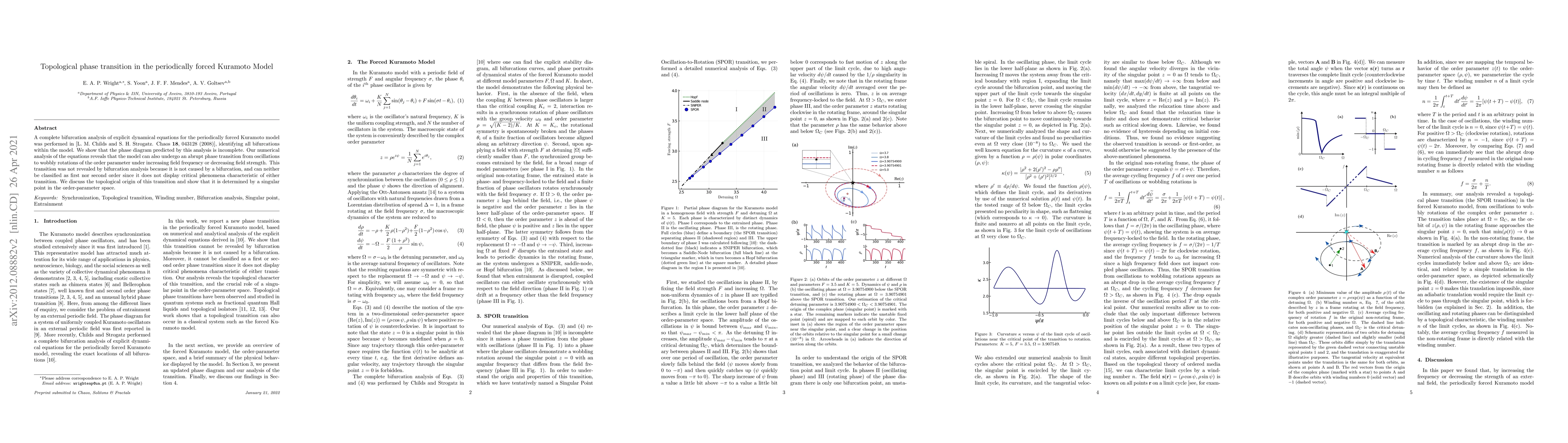 A complete bifurcation analysis of explicit dynamical equations for the periodically forced Kuramoto model was performed in [L. M. Childs and S. H. Strogatz. Chaos 18 , 043128 (2008)], identifying all bifurcations within the model. We show that the phase diagram predicted by this analysis is incomplete. Our numerical analysis of the equations reveals that the model can also undergo an abrupt phase transition from oscillations to wobbly rotations of the order parameter under increasing field frequency or decreasing field strength. This transition was not revealed by bifurcation analysis because it is not caused by a bifurcation, and can neither be classified as first nor second-order since it does not display critical phenomena characteristic of either transition. We discuss the topological origin of this transition and show that it is determined by a singular point in the order-parameter space.