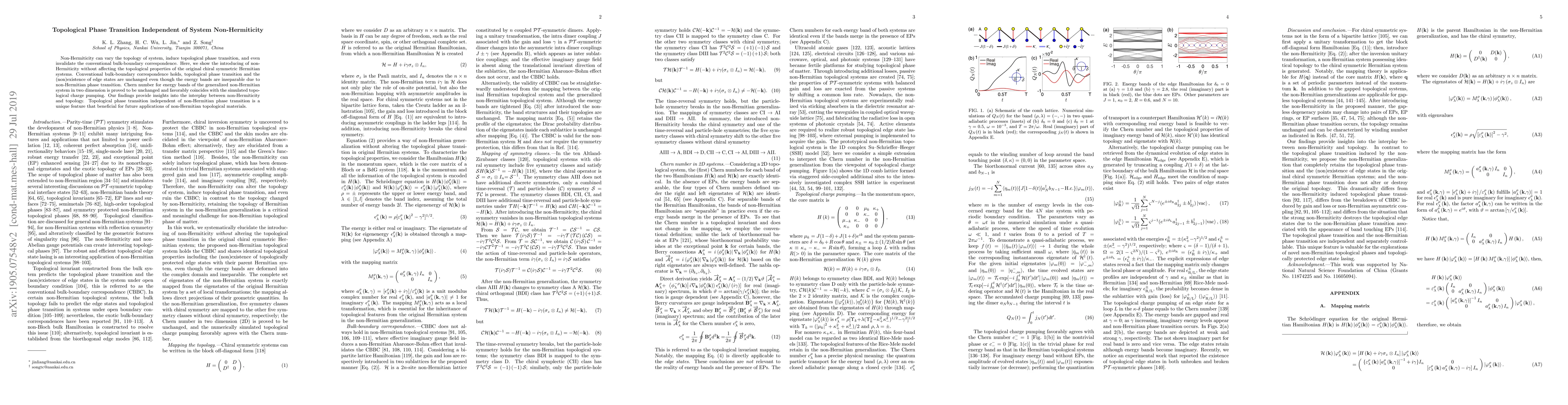 Non-Hermiticity can vary the topology of system, induce topological phase transition, and even invalidate the conventional bulk-boundary correspondence. Here, we show the introducing of non-Hermiticity without affecting the topological properties of the original chiral symmetric Hermitian systems. Conventional bulk-boundary correspondence holds, topological phase transition and the (non)existence of edge states are unchanged even though the energy bands are inseparable due to non-Hermitian phase transition. Chern number for energy bands of the generalized non-Hermitian system in two dimension is proved to be unchanged and favorably coincides with the simulated topological charge pumping. Our findings provide insights into the interplay between non-Hermiticity and topology. Topological phase transition independent of non-Hermitian phase transition is a unique feature that beneficial for future applications of non-Hermitian topological materials.