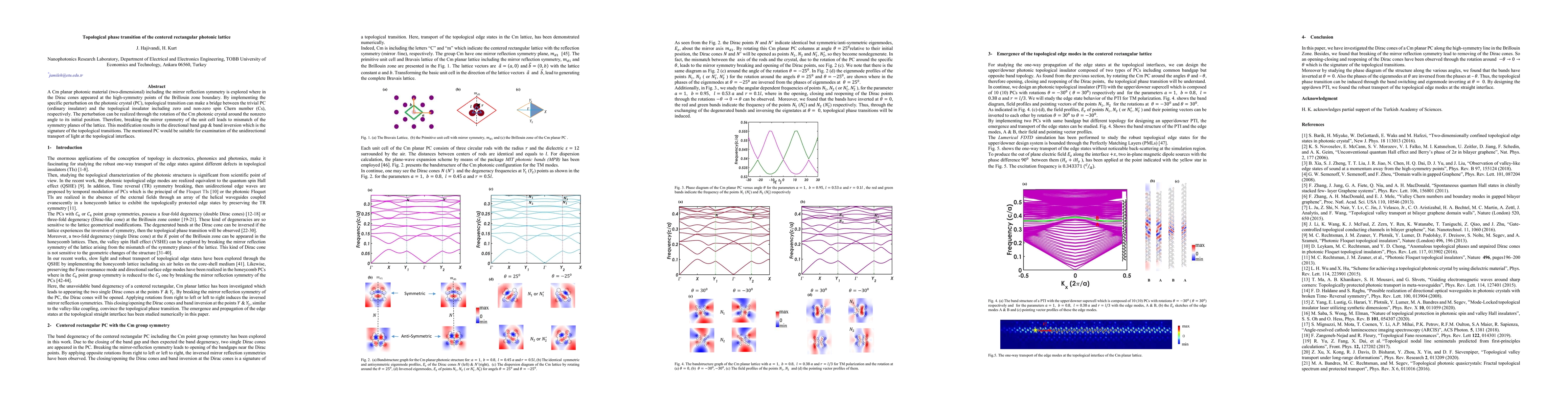 A Cm planar photonic material (two-dimensional) including the mirror reflection symmetry is explored where in the Dirac cones appeared at the high-symmetry points of the Brillouin zone boundary. By implementing the specific perturbation on the photonic crystal (PC), topological transition can make a bridge between the trivial PC (ordinary insulator) and the topological insulator including zero and non-zero spin Chern number (Cs), respectively. The perturbation can be realized through the rotation of the Cm photonic crystal around the nonzero angle to its initial position. Therefore, breaking the mirror symmetry of the unit cell leads to mismatch of the symmetry planes of the lattice. This modification results in the directional band gap & band inversion which is the signature of the topological transitions. The mentioned PC would be suitable for examination of the unidirectional transport of light at the topological interfaces.