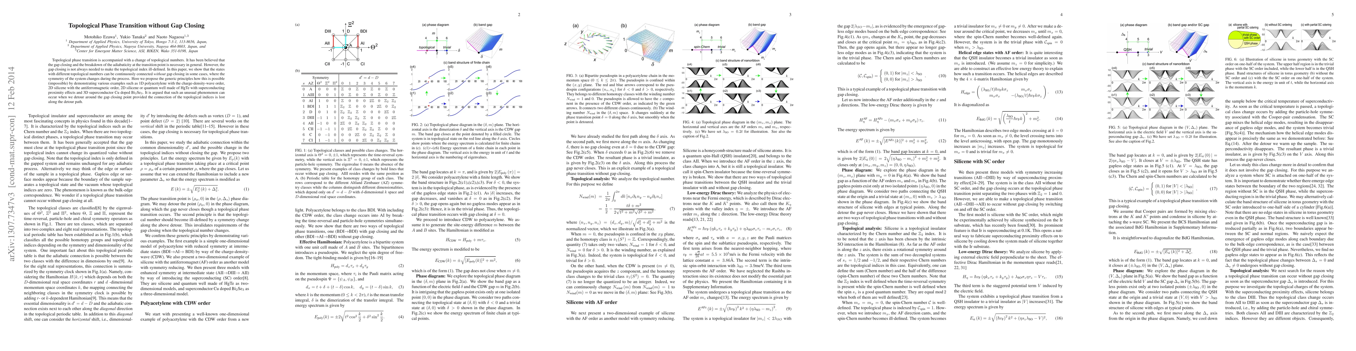 The research demonstrates topological phase transitions without gap closing by analyzing various models such as 1D polyacetylene, 2D silicene, and 3D superconductor Cu doped Bi2Se3, utilizing symmetry changes and detouring around the gap closing point.