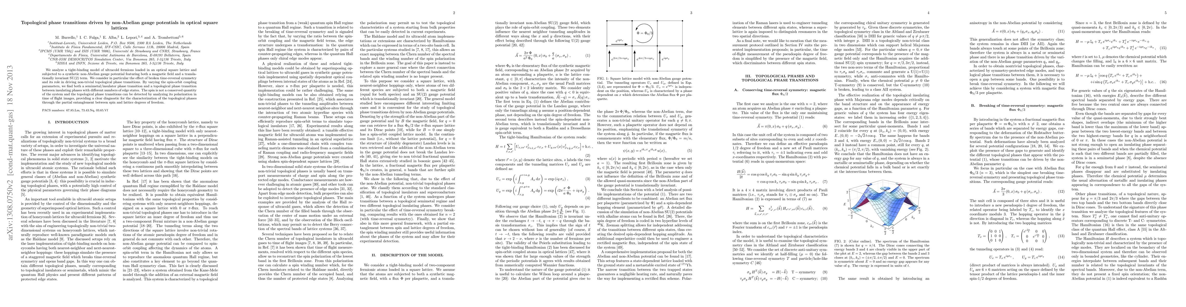 We analyze a tight-binding model of ultracold fermions loaded in an optical square lattice and subjected to a synthetic non-Abelian gauge potential featuring both a magnetic field and a translationally invariant SU(2) term. We consider in particular the effect of broken time-reversal symmetry and its role in driving non-trivial topological phase transitions. By varying the spin-orbit coupling parameters, we find both a semimetal/insulator phase transition and a topological phase transition between insulating phases with different numbers of edge states. The spin is not a conserved quantity of the system and the topological phase transitions can be detected by analyzing its polarization in time of flight images, providing a clear diagnostic for the characterization of the topological phases through the partial entanglement between spin and lattice degrees of freedom.