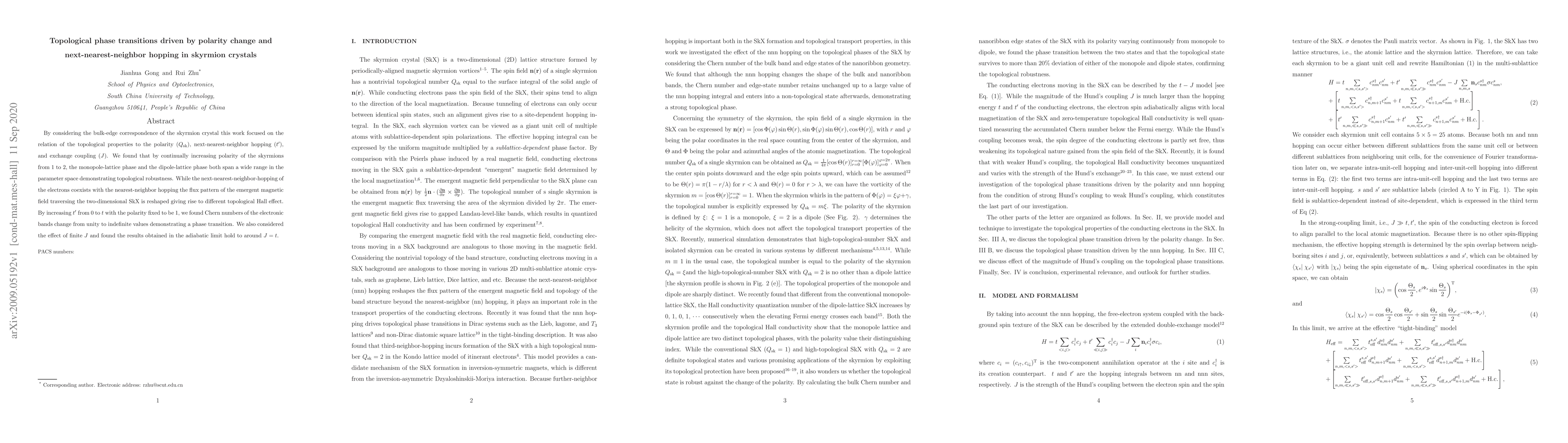 This paper investigates topological phase transitions in skyrmion crystals driven by changes in polarity and next-nearest-neighbor hopping. It reveals that varying polarity and next-nearest-neighbor hopping alters topological properties and the topological Hall effect, leading to phase transitions in the Chern numbers of electronic bands.