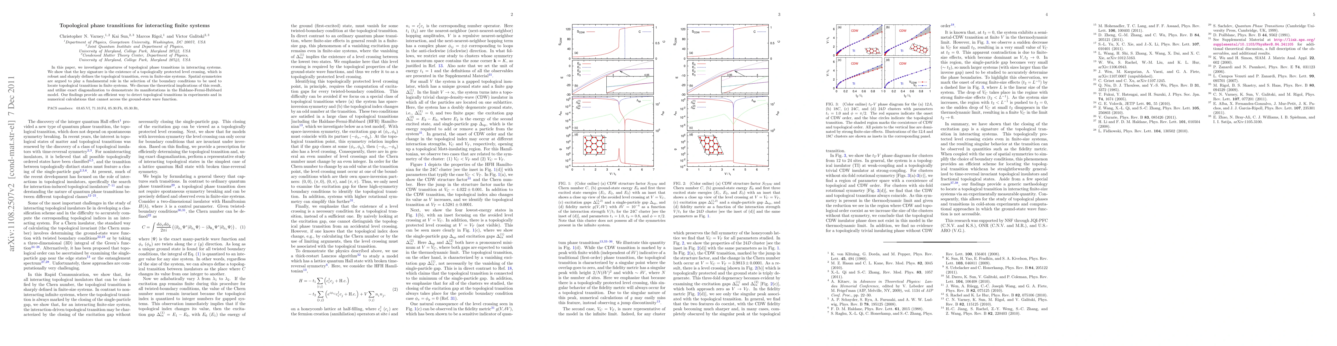 This paper explores topological phase transitions in interacting finite systems, identifying a topologically protected level crossing as a key signature. It argues that spatial symmetries determine the boundary conditions for detecting these transitions, and uses exact diagonalization to demonstrate the Haldane-Fermi-Hubbard model's implications, offering a practical method for experimental and numerical detection.