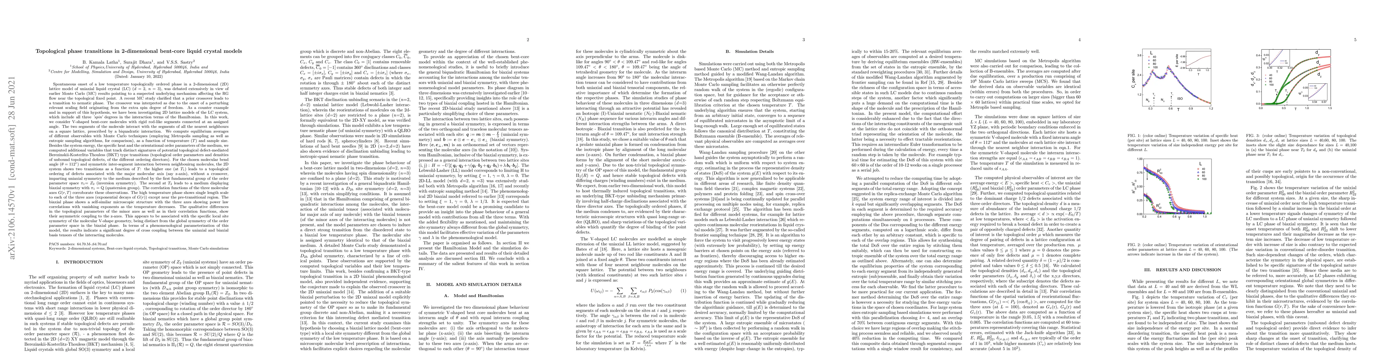 Spontaneous onset of a low temperature topologically ordered phase in a 2-dimensional (2D) lattice model of uniaxial liquid crystal (LC) was debated extensively pointing to a suspected underlying mechanism affecting the RG flow near the topological fixed point. A recent MC study clarified that a prior crossover leads to a transition to nematic phase. The crossover was interpreted as due to the onset of a perturbing relevant scaling field originating from the extra spin degree of freedom. As a counter example and in support of this hypothesis, we now consider V-shaped bent-core molecules with rigid rod-like segments connected at an assigned angle. The two segments of the molecule interact with the segments of all the nearest neighbours on a square lattice, prescribed by a biquadratic interaction. We compute equilibrium averages of different observables with Monte Carlo techniques as a function of temperature and sample size. For the chosen molecular bend angle and symmetric inter-segment interaction between neighbouirng molecules, the 2D system shows two transitions as a function of T: the higher one at T1 leads to a topological ordering of defects associated with the major molecular axis without a crossover, imparting uniaxial symmetry to the medium described by the first fundamental group of the order parameter space $\pi_{1}$= $Z_{2}$ (inversion symmetry). The second at T2 leads to a medium displaying biaxial symmetry with $\pi_{1}$ = Q (quaternion group). The biaxial phase shows a self-similar microscopic structure with the three axes showing power law correlations with vanishing exponents as the temperature decreases.