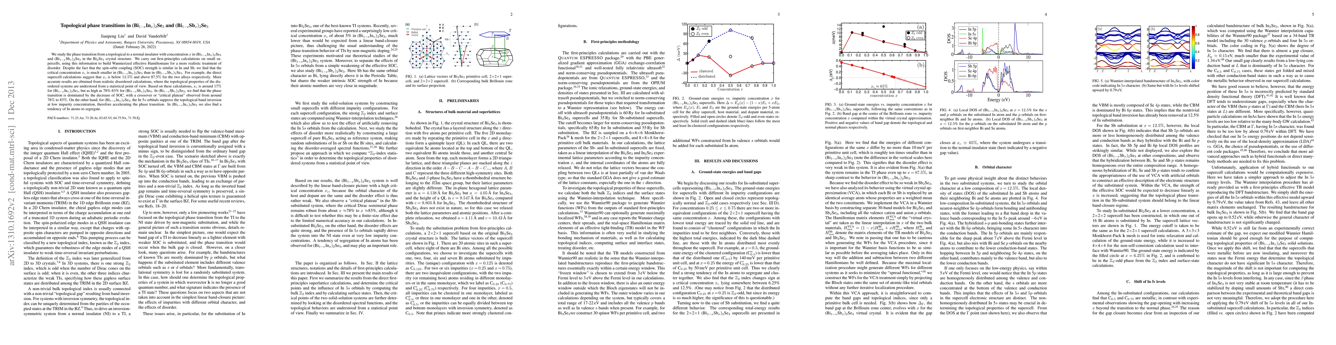 We study the phase transition from a topological to a normal insulator with concentration $x$ in (Bi$_{1-x}$In$_{x})_2$Se$_3$ and (Bi$_{1-x}$Sb$_{x})_2$Se$_3$ in the Bi$_2$Se$_3$ crystal structure. We carry out first-principles calculations on small supercells, using this information to build Wannierized effective Hamiltonians for a more realistic treatment of disorder. Despite the fact that the spin-orbit coupling (SOC) strength is similar in In and Sb, we find that the critical concentration $x_{\rm c}$ is much smaller in (Bi$_{1-x}$In$_{x})_2$Se$_3$ than in (Bi$_{1-x}$Sb$_{x})_2$Se$_3$. For example, the direct supercell calculations suggest that $x_{\rm c}$ is below 12.5% and above 87.5$%$ for the two alloys respectively. More accurate results are obtained from realistic disordered calculations, where the topological properties of the disordered systems are understood from a statistical point of view. Based on these calculations, $x_c$ is around 17% for (Bi$_{1-x}$In$_{x})_2$Se$_3$, but as high as 78%-83% for (Bi$_{1-x}$Sb$_{x})_2$Se$_3$. In (Bi$_{1-x}$Sb$_{x})_2$Se$_3$, we find that the phase transition is dominated by the decrease of SOC, with a crossover or "critical plateau" observed from around 78$%$ to 83$%$. On the other hand, for (Bi$_{1-x}$In$_{x})_2$Se$_3$, the In 5$s$ orbitals suppress the topological band inversion at low impurity concentration, therefore accelerating the phase transition. In (Bi$_{1-x}$In$_{x})_2$Se$_3$ we also find a tendency of In atoms to segregate.