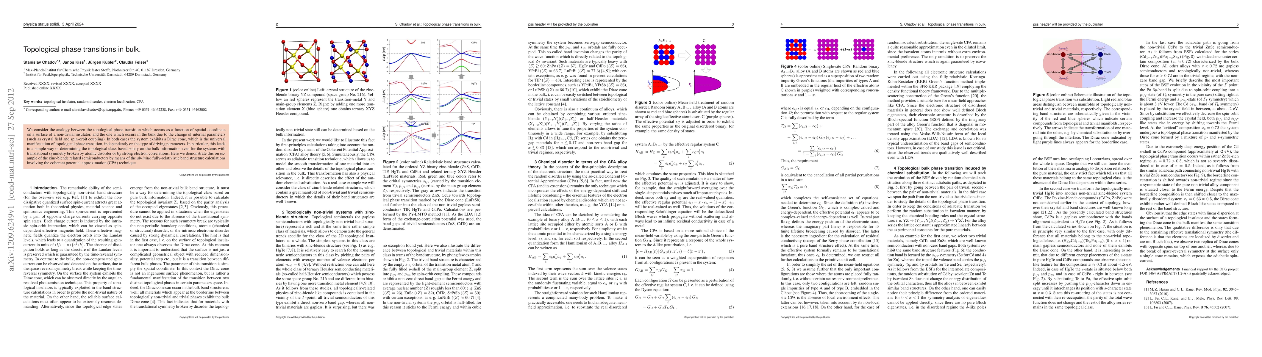 We consider the analogy between the topological phase transition which occurs as a function of spatial coordinate on a surface of a non-trivial insulator, and the one which occurs in the bulk due to the change of internal parameters (such as crystal field and spin-orbit coupling). In both cases the system exhibits a Dirac cone, which is the universal manifestation of topological phase transition, independently on the type of driving parameters. In particular, this leads to a simple way of determining the topological class based solely on the bulk information even for the systems with translational symmetry broken by atomic disorder or by strong electron correlations. Here we demonstrate this on example of the zinc-blende related semiconductors by means of the {\it ab-initio} fully-relativistic band structure calculations involving the coherent potential approximation (CPA) technique.