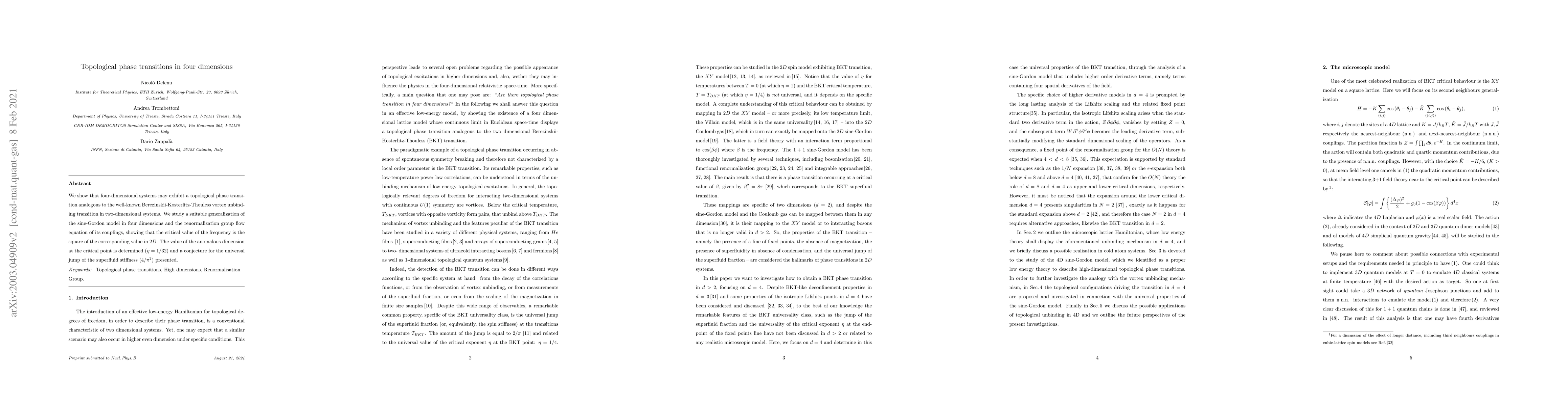 This research demonstrates a topological phase transition in four-dimensional systems analogous to the Berezinskii-Kosterlitz-Thouless transition in two dimensions. It presents an engineered quantum system where this transition occurs, analyzes a generalized sine-Gordon model, and determines critical values and universal properties, including an anomalous dimension of $\eta=1/32$ and a conjectured universal jump in superfluid stiffness.