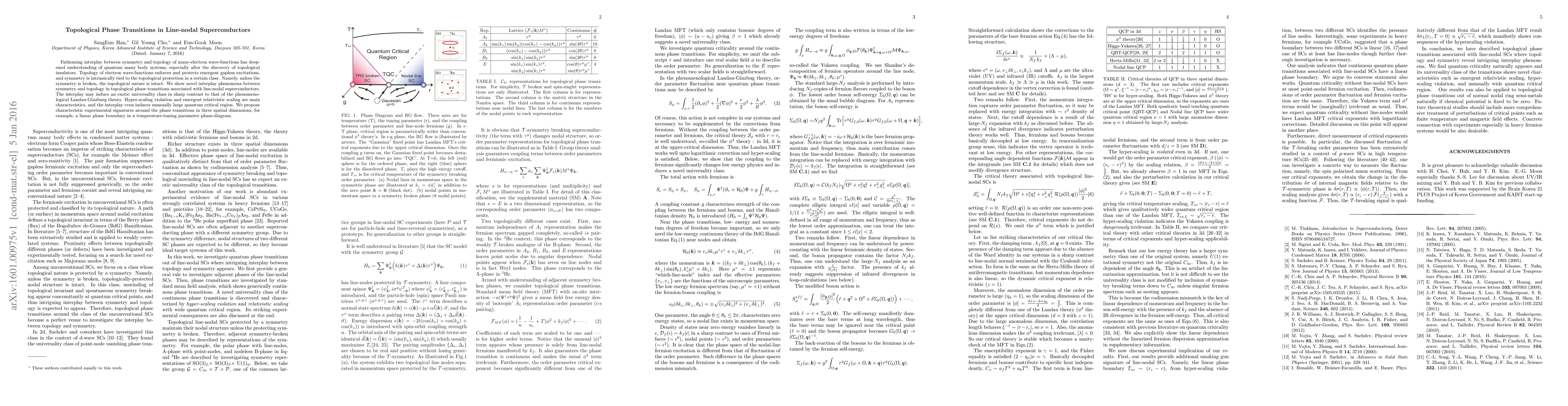 This paper explores the novel interplay between symmetry and topology in topological phase transitions of line-nodal superconductors, revealing an exotic universality class with hyper-scaling violation and emergent relativistic scaling, and proposing experimental signatures such as a linear phase boundary in a temperature-tuned phase diagram.