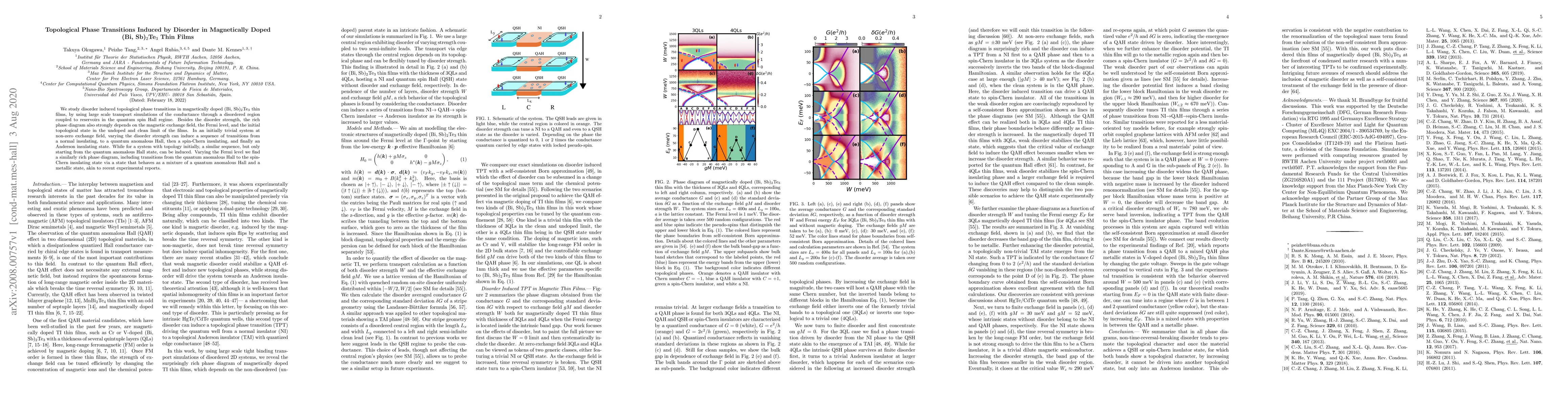 This paper investigates how disorder in magnetically doped (Bi, Sb)$_2$Te$_3$ thin films induces topological phase transitions, revealing a complex phase diagram dependent on disorder strength, magnetic exchange field, Fermi level, and initial topological state. The study finds transitions from insulating to quantum anomalous Hall, spin-Chern, and Anderson insulating states under varying conditions.