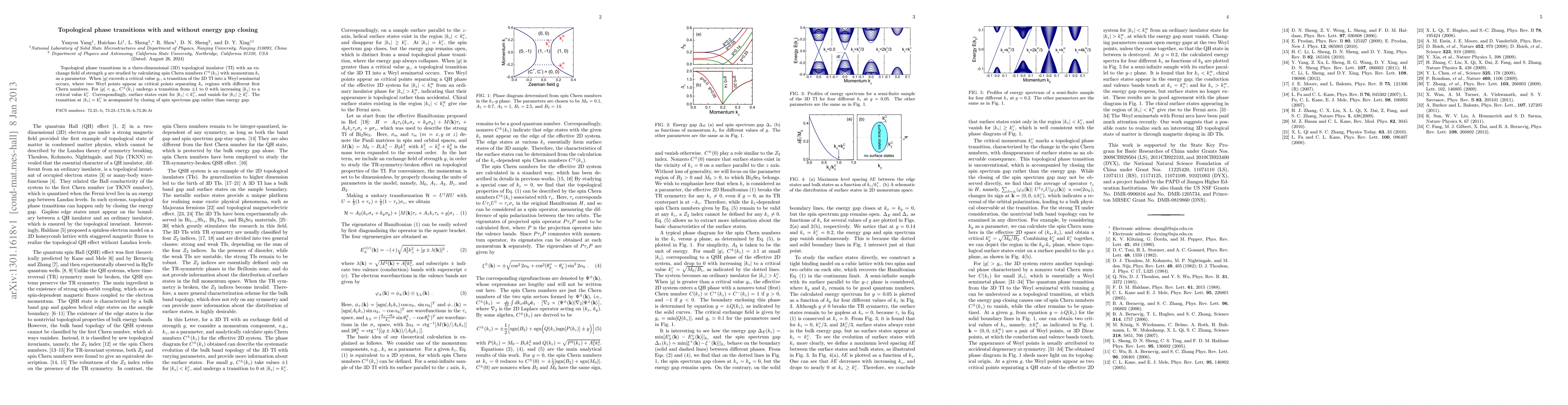 This paper investigates topological phase transitions in a 3D topological insulator under an exchange field, showing that a critical field strength induces a transition into a Weyl semimetal. The transition without energy gap closing involves the closing of the spin spectrum gap instead of the energy gap.