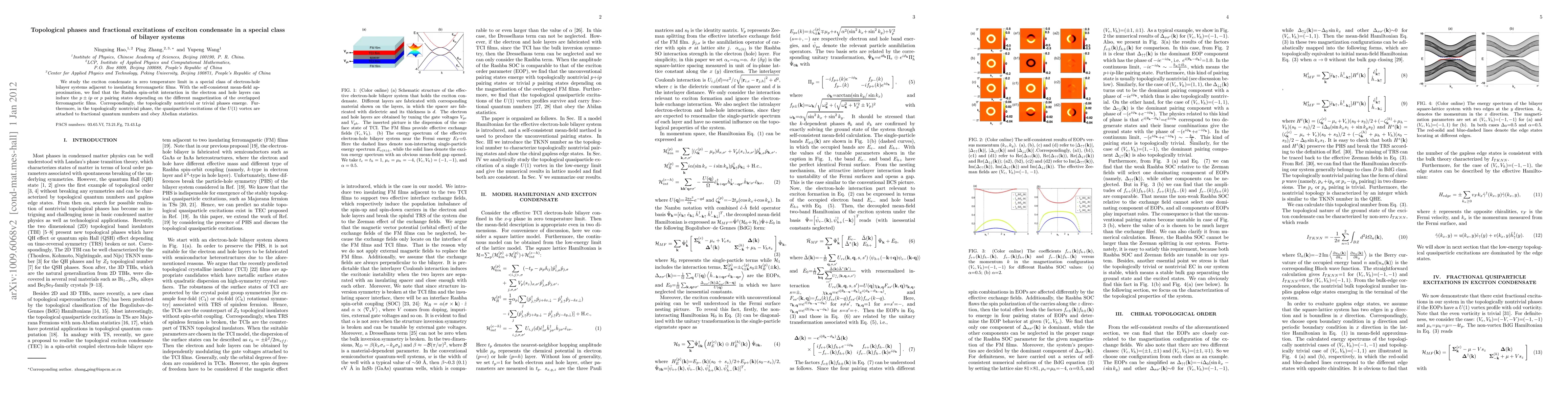 This paper investigates exciton condensates in electron-hole bilayer systems near insulating ferromagnetic films, revealing that Rashba spin-orbit interaction can induce p±ip pairing states, leading to topologically nontrivial or trivial phases. In the nontrivial phase, U(1) vortex quasiparticles exhibit fractional quantum numbers and Abelian statistics.