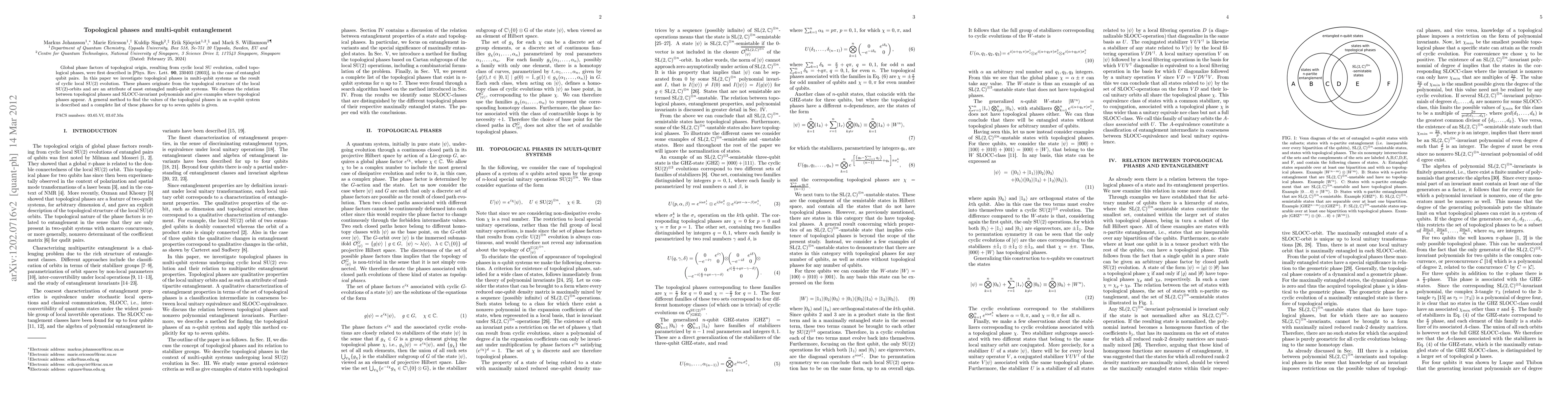 Global phase factors of topological origin, resulting from cyclic local $\rm{SU}$ evolution, called topological phases, were first described in [Phys. Rev. Lett. {\bf 90}, 230403 (2003)], in the case of entangled qubit pairs. In this paper we investigate topological phases in multi-qubit systems as the result of cyclic local $\rm{SU(2)}$ evolution. These phases originate from the topological structure of the local $\rm{SU(2)}$-orbits and are an attribute of most entangled multi-qubit systems. We discuss the relation between topological phases and SLOCC-invariant polynomials and give examples where topological phases appear. A general method to find the values of the topological phases in an $n$-qubit system is described and a complete list of these phases for up to seven qubits is given.