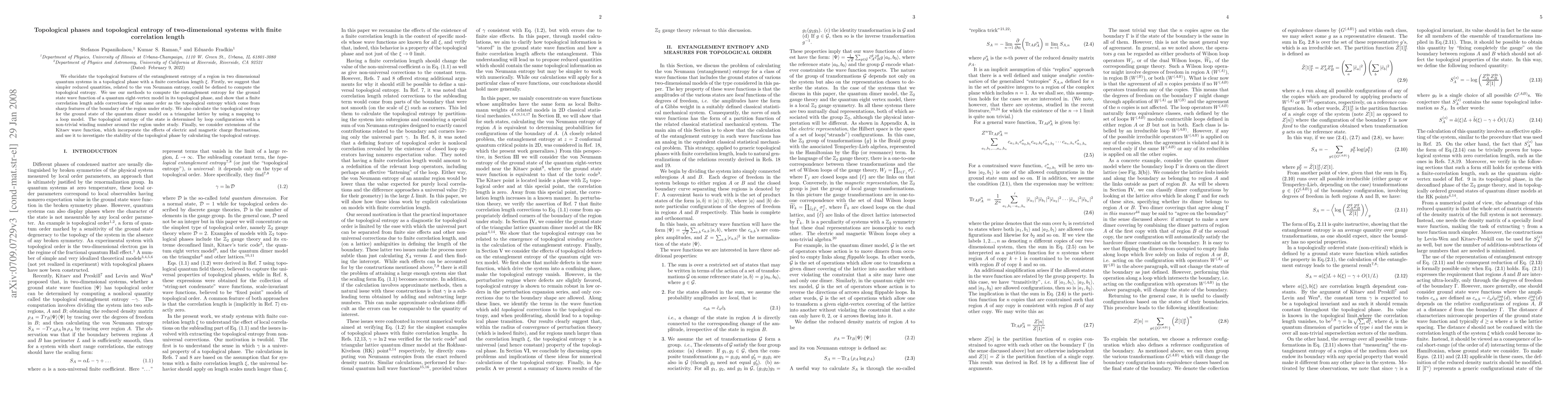 We elucidate the topological features of the entanglement entropy of a region in two dimensional quantum systems in a topological phase with a finite correlation length $\xi$. Firstly, we suggest that simpler reduced quantities, related to the von Neumann entropy, could be defined to compute the topological entropy. We use our methods to compute the entanglement entropy for the ground state wave function of a quantum eight-vertex model in its topological phase, and show that a finite correlation length adds corrections of the same order as the topological entropy which come from sharp features of the boundary of the region under study. We also calculate the topological entropy for the ground state of the quantum dimer model on a triangular lattice by using a mapping to a loop model. The topological entropy of the state is determined by loop configurations with a non-trivial winding number around the region under study. Finally, we consider extensions of the Kitaev wave function, which incorporate the effects of electric and magnetic charge fluctuations, and use it to investigate the stability of the topological phase by calculating the topological entropy.