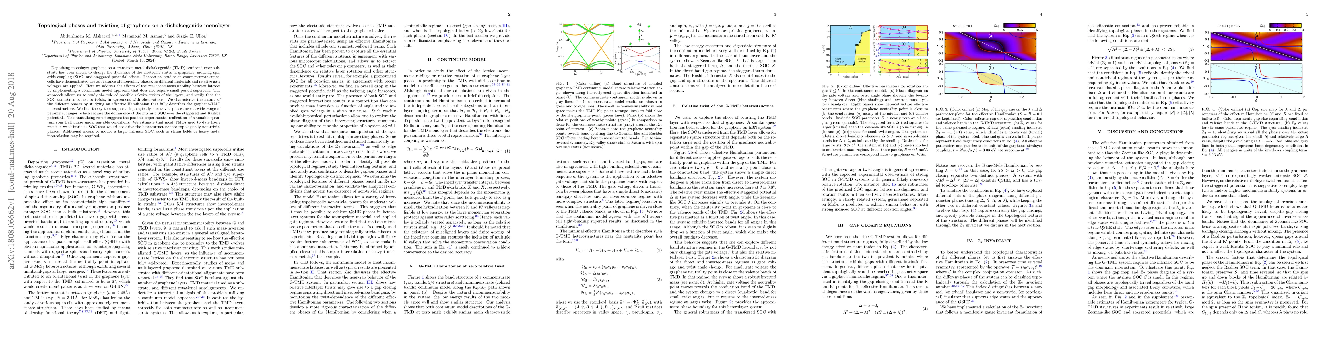 Depositing monolayer graphene on a transition metal dichalcogenide (TMD) semiconductor substrate has been shown to change the dynamics of the electronic states in graphene, inducing spin orbit coupling (SOC) and staggered potential effects. Theoretical studies on commensurate supercells have demonstrated the appearance of interesting phases, as different materials and relative gate voltages are applied. Here we address the effects of the real incommensurability between lattices by implementing a continuum model approach that does not require small-period supercells. The approach allows us to study the role of possible relative twists of the layers, and verify that the SOC transfer is robust to twists, in agreement with observations. We characterize the nature of the different phases by studying an effective Hamiltonian that fully describes the graphene-TMD heterostructure. We find the system supports topologically non-trivial phases over a wide range of parameter ranges, which require the dominance of the intrinsic SOC over the staggered and Rashba potentials. This tantalizing result suggests the possible experimental realization of a tunable quantum spin Hall phase under suitable conditions. We estimate that most TMDs used to date likely result in weak intrinsic SOC that would not drive the heterostructure into topologically non-trivial phases. Additional means to induce a larger intrinsic SOC, such as strain fields or heavy metal intercalation may be required.