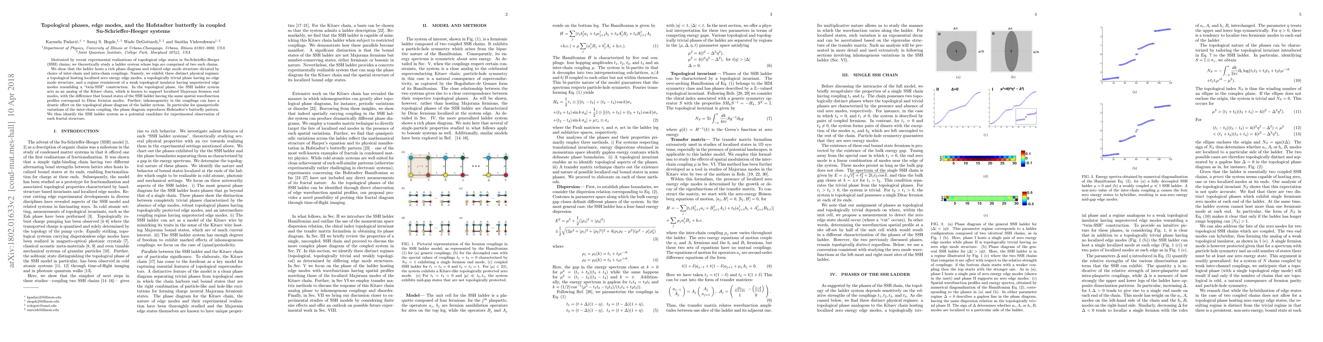 This paper investigates a coupled ladder system composed of Su-Schrieffer-Heeger (SSH) chains, revealing a complex phase diagram with topological, trivial, and weak topological insulating regimes. The topological phase exhibits localized zero energy edge modes, akin to Majorana fermions in Kitaev chains, but with Dirac fermion modes instead. Inhomogeneity in couplings leads to a quasiperiodic Hofstadter butterfly pattern, suggesting the SSH ladder as a candidate for experimental observation of fractal topological structures.