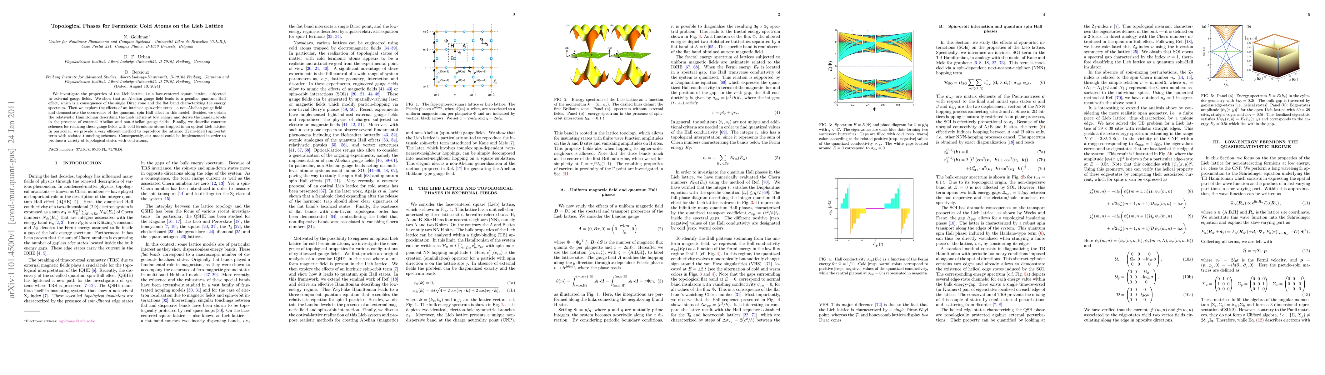 This paper explores the topological phases of fermionic cold atoms on the Lieb lattice, demonstrating quantum Hall and spin Hall effects due to external and intrinsic gauge fields. It proposes a method for realizing these effects using cold atoms in optical lattices, highlighting efficient schemes for intrinsic spin-orbit coupling.