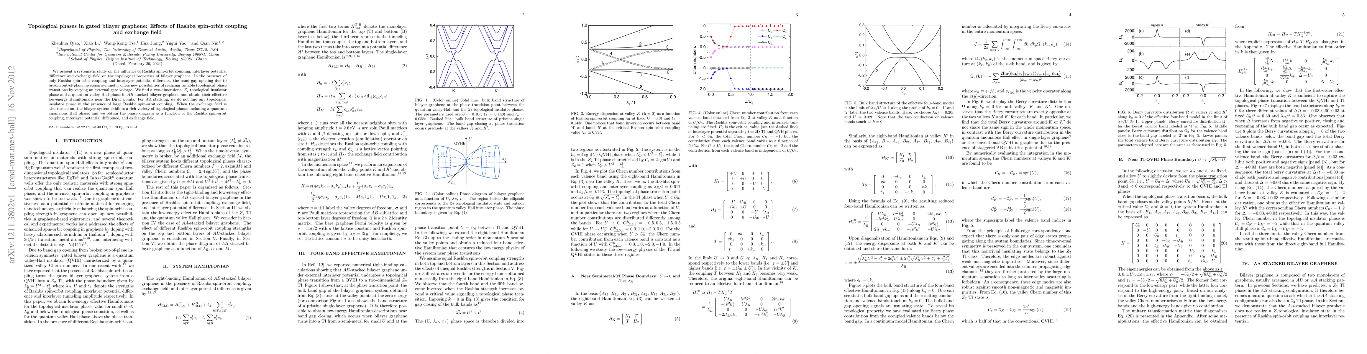 This paper explores the topological phases in bilayer graphene under Rashba spin-orbit coupling, interlayer potential, and exchange field. It identifies $Z_2$ topological insulator and quantum valley Hall phases in $AB$-stacked graphene, while $AA$-stacked graphene lacks such phases without an exchange field. With an exchange field, a quantum anomalous Hall phase emerges, and a comprehensive phase diagram is provided.