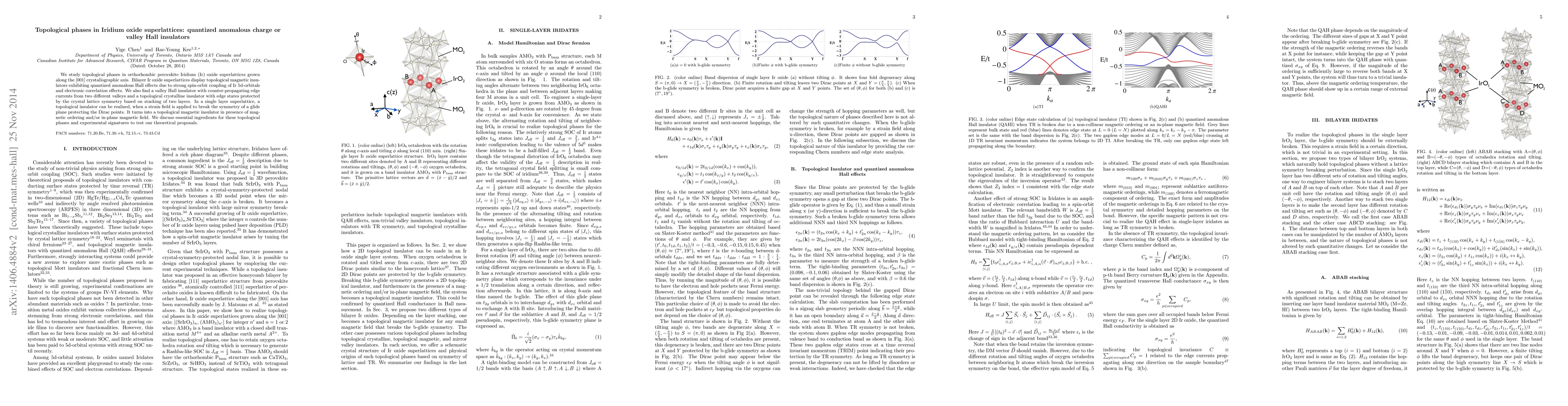 This paper investigates topological phases in Iridium oxide superlattices, revealing quantized anomalous Hall insulators, valley Hall insulators, and topological crystalline insulators due to strong spin-orbit coupling and electronic correlations. Experimental signatures are proposed to verify these theoretical findings.