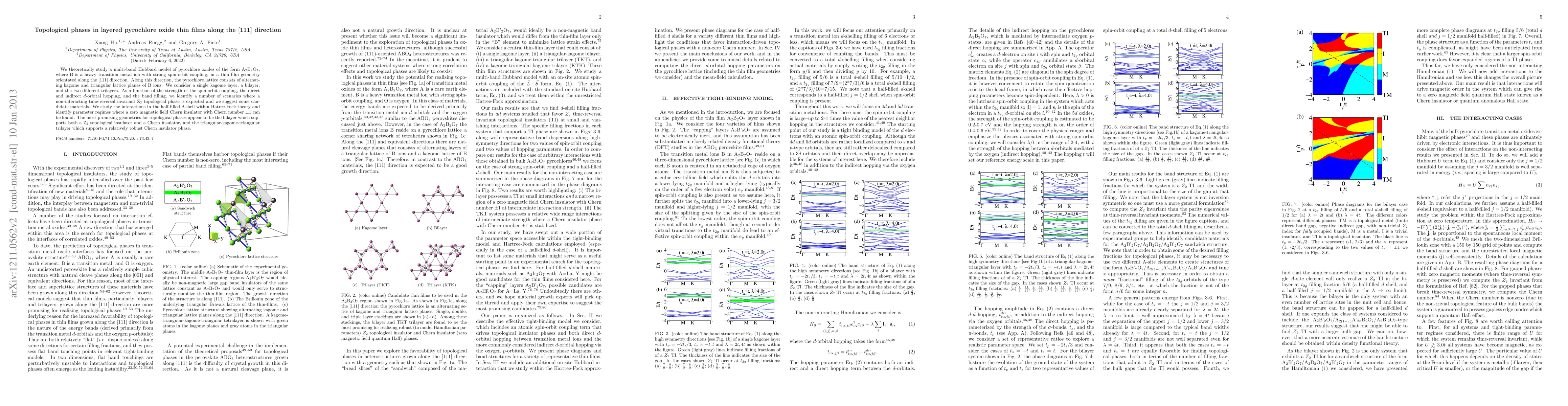 This paper theoretically investigates layered pyrochlore oxide thin films oriented along the [111] direction, revealing potential for non-interacting time-reversal invariant Z$_2$ topological phases and Chern insulators depending on spin-orbit coupling, orbital interactions, and band filling. The bilayer configuration shows promise for both Z$_2$ topological and Chern insulating states.