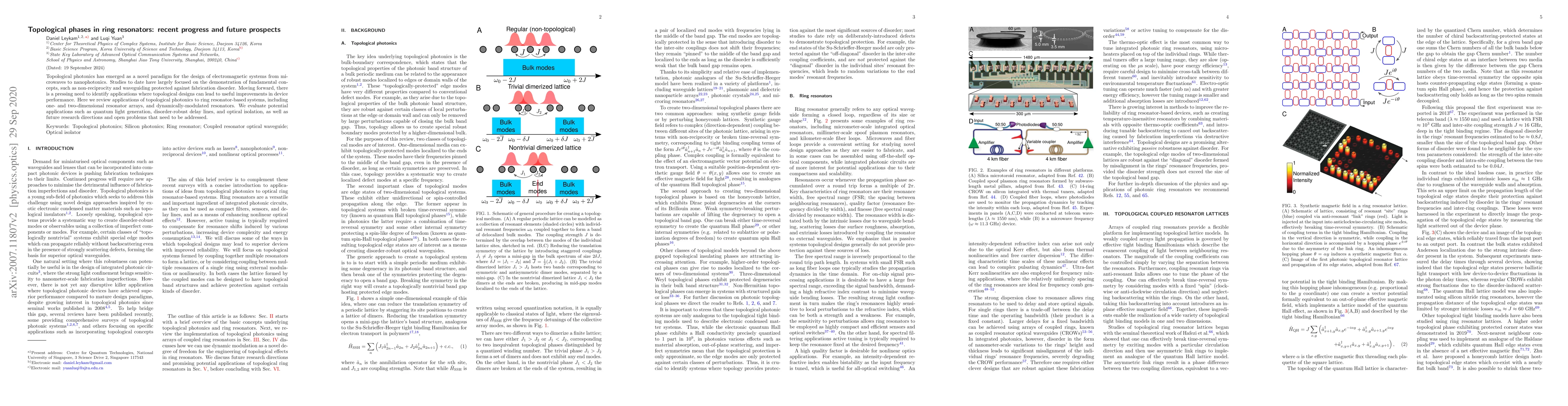 This paper reviews recent advancements in topological photonics applied to ring resonators, highlighting potential applications in quantum light generation, robust delay lines, and optical isolation. It also discusses future research directions and challenges that need to be addressed to fully exploit topological designs for improved device performance.