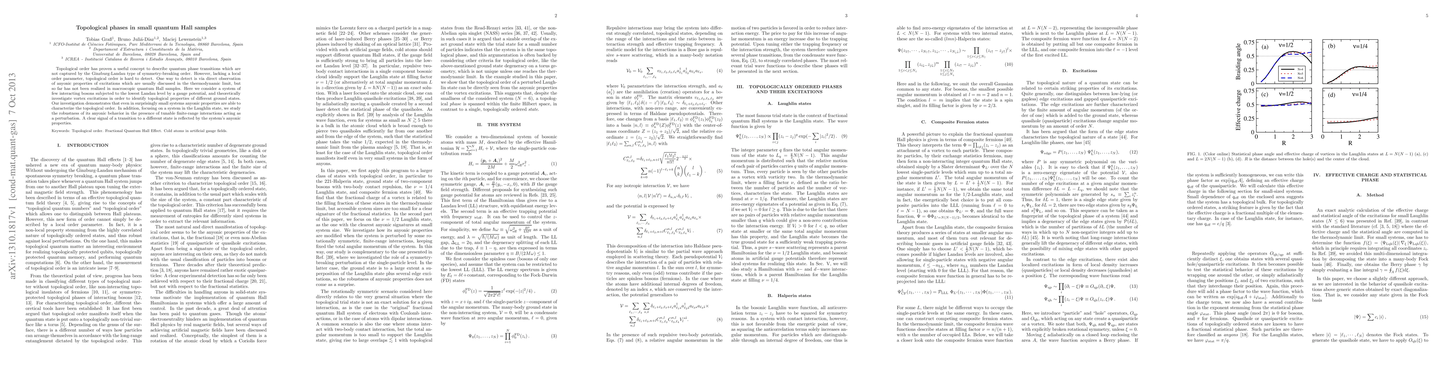 Topological order has proven a useful concept to describe quantum phase transitions which are not captured by the Ginzburg-Landau type of symmetry-breaking order. However, lacking a local order parameter, topological order is hard to detect. One way to detect is via direct observation of anyonic properties of excitations which are usually discussed in the thermodynamic limit, but so far has not been realized in macroscopic quantum Hall samples. Here we consider a system of few interacting bosons subjected to the lowest Landau level by a gauge potential, and theoretically investigate vortex excitations in order to identify topological properties of different ground states. Our investigation demonstrates that even in surprisingly small systems anyonic properties are able to characterize the topological order. In addition, focusing on a system in the Laughlin state, we study the robustness of its anyonic behavior in the presence of tunable finite-range interactions acting as a perturbation. A clear signal of a transition to a different state is reflected by the system's anyonic properties.