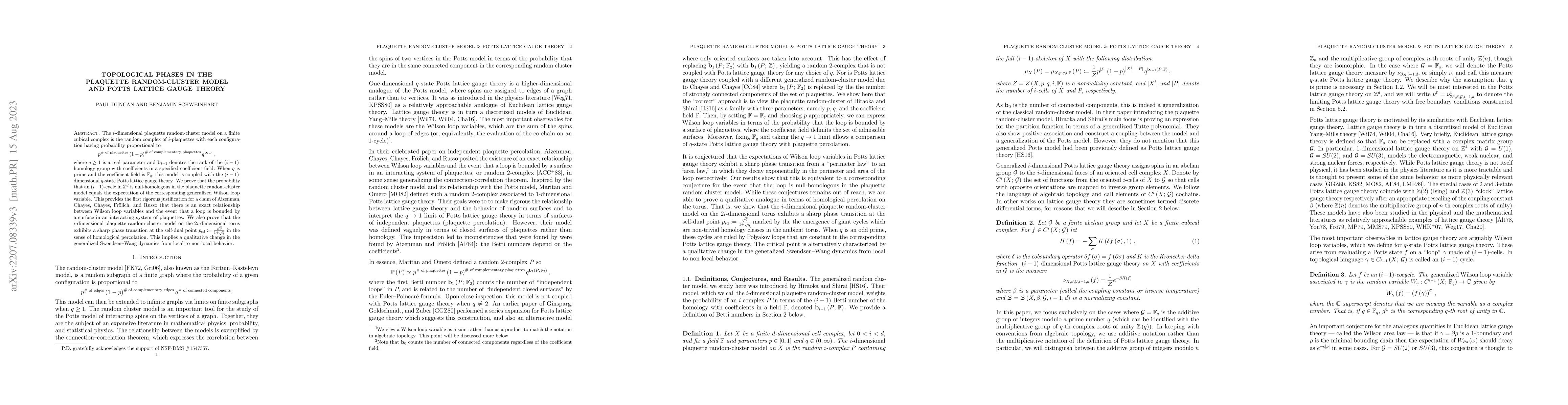 The $i$-dimensional plaquette random-cluster model on a finite cubical complex is the random complex of $i$-plaquettes with each configuration having probability proportional to $$p^{\text{# of plaquettes}}(1-p)^{\text{# of complementary plaquettes}}q^{\mathbf{ b}_{i-1}},$$ where $q\geq 1$ is a real parameter and $\mathbf{b}_{i-1}$ denotes the rank of the $(i-1)$-homology group with coefficients in a specified coefficient field. When $q$ is prime and the coefficient field is $\mathbb{F}_q$, this model is coupled with the $(i-1)$-dimensional $q$-state Potts lattice gauge theory. We prove that the probability that an $(i-1)$-cycle in $\mathbb{Z}^d$ is null-homologous in the plaquette random-cluster model equals the expectation of the corresponding generalized Wilson loop variable. This provides the first rigorous justification for a claim of Aizenman, Chayes, Chayes, Fr\"olich, and Russo that there is an exact relationship between Wilson loop variables and the event that a loop is bounded by a surface in an interacting system of plaquettes. We also prove that the $i$-dimensional plaquette random-cluster model on the $2i$-dimensional torus exhibits a sharp phase transition at the self-dual point $p_{\mathrm{sd}} \mathrel{\vcenter{:}}= \frac{\sqrt{q}}{1+\sqrt{q}}$ in the sense of homological percolation. This implies a qualitative change in the generalized Swendsen--Wang dynamics from local to non-local behavior.