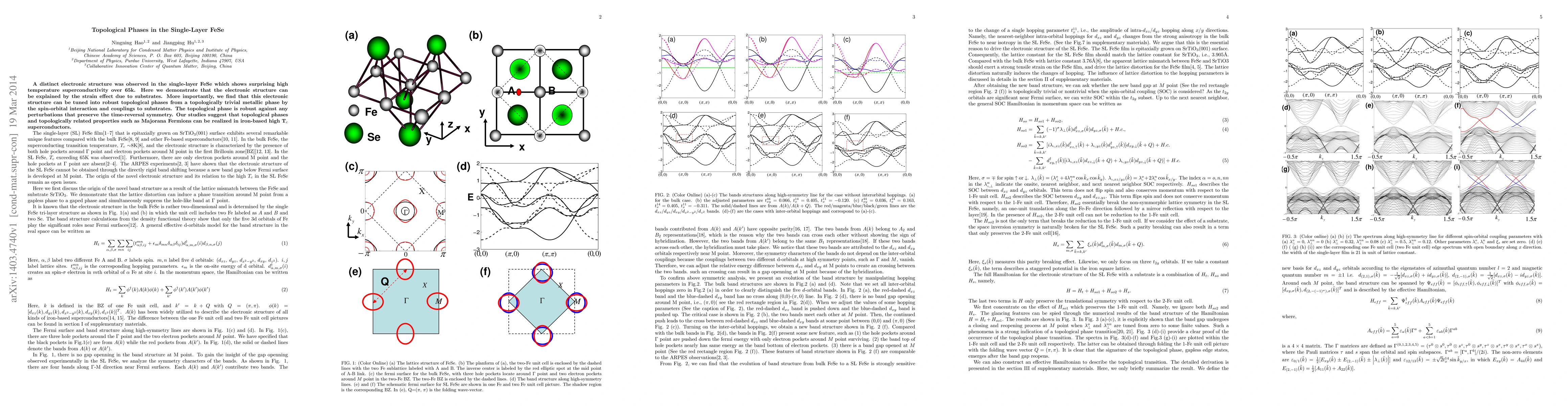 A distinct electronic structure was observed in the single-layer FeSe which shows surprising high temperature superconductivity over 65k. Here we demonstrate that the electronic structure can be explained by the strain effect due to substrates. More importantly, we find that this electronic structure can be tuned into robust topological phases from a topologically trivial metallic phase by the spin-orbital interaction and couplings to substrates. The topological phase is robust against any perturbations that preserve the time-reversal symmetry. Our studies suggest that topological phases and topologically related properties such as Majorana Fermions can be realized in iron-based high T$_{c}$ superconductors.