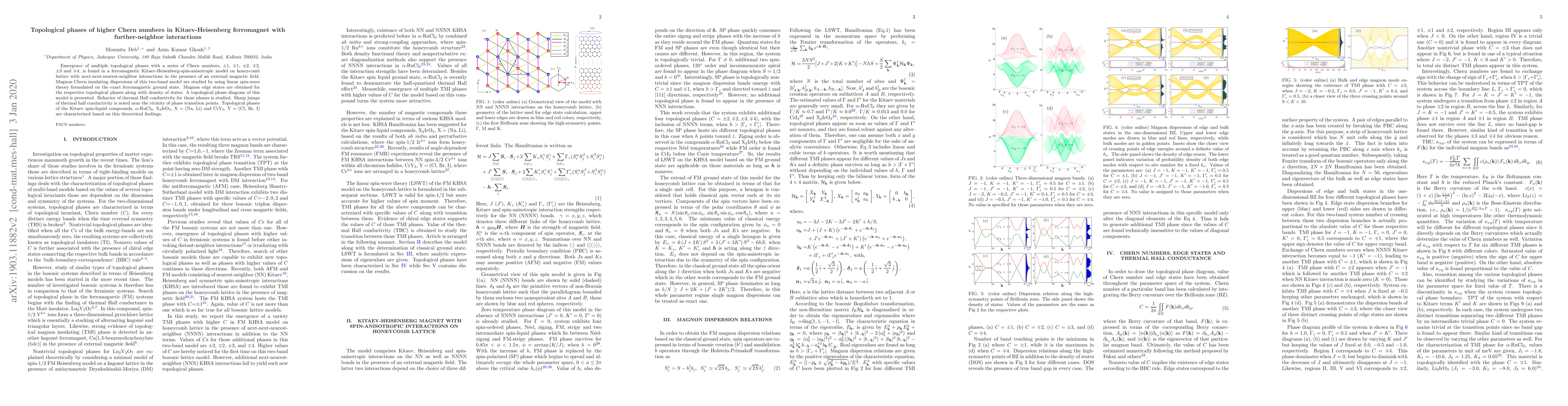 Emergence of multiple topological phases with a series of Chern numbers, $\pm 1$, $\mp 1$, $\pm 2$, $\mp 2$, $\pm 3$ and $\mp 4$, are observed in a ferromagnetic Kitaev-Heisenberg-spin-anisotropic model on honeycomb lattice with further neighbor interactions in the presence of an external magnetic field. Magnon Chern insulating dispersions of this two-band model are studied by using linear spin-wave theory formulated on the exact ferromagnetic ground state. Magnon edge states are obtained for the respective topological phases along with density of states. A topological phase diagram of this model is presented. Behavior of thermal Hall conductivity for those phases is studied. Sharp jumps of thermal hall conductivity is noted near the vicinity of phase transition points. Topological phases of the Kitaev spin-liquid compounds, $\alpha$-RuCl$_3$, X$_2$IrO$_3$, X = (Na, Li) and CrY$_3$, Y = (Cl, Br, I) are characterized based on this theoretical findings.