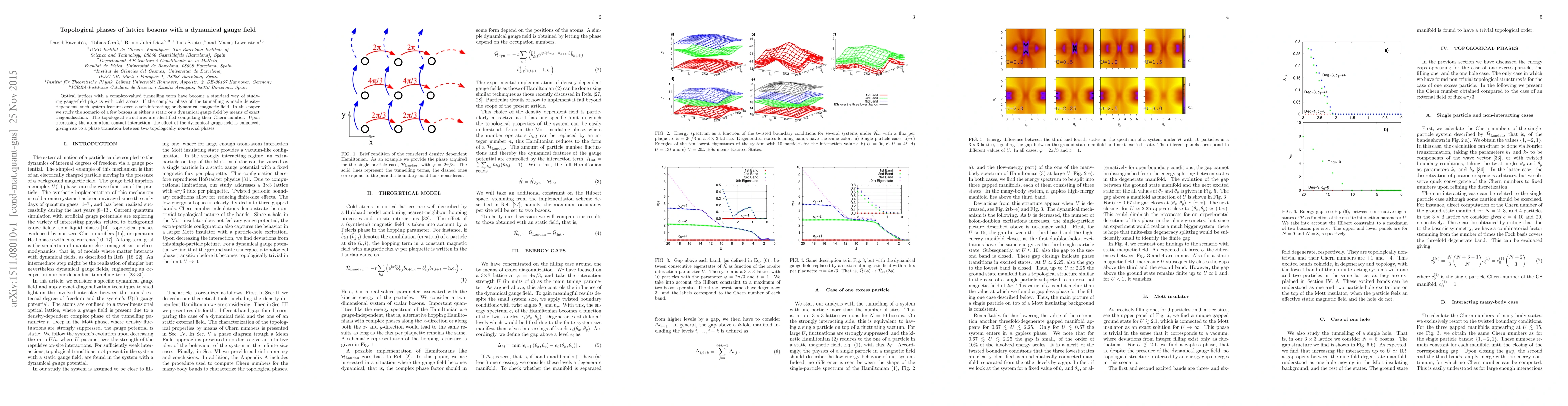 Optical lattices with a complex-valued tunnelling term have become a standard way of studying gauge-field physics with cold atoms. If the complex phase of the tunnelling is made density-dependent, such system features even a self-interacting or dynamical magnetic field. In this paper we study the scenario of a few bosons in either a static or a dynamical gauge field by means of exact diagonalization. The topological structures are identified computing their Chern number. Upon decreasing the atom-atom contact interaction, the effect of the dynamical gauge field is enhanced, giving rise to a phase transition between two topologically non-trivial phases.