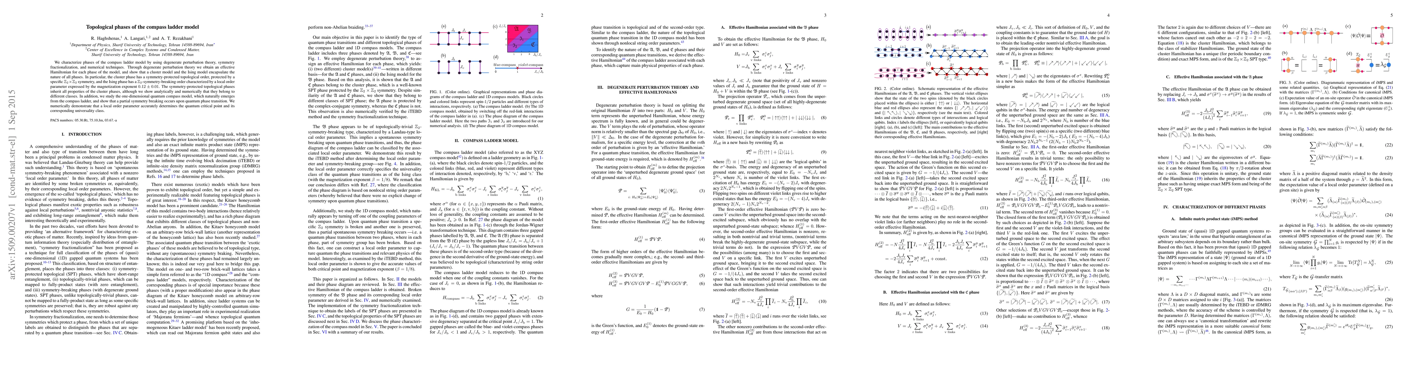 This paper characterizes topological phases in the compass ladder model using degenerate perturbation theory, symmetry fractionalization, and numerical techniques. It identifies distinct phases, including a symmetry-protected topological phase and an Ising phase with a $\mathbb{Z}_2$-symmetry-breaking order, and demonstrates the emergence of a one-dimensional quantum compass model with a partial symmetry breaking at the quantum phase transition.